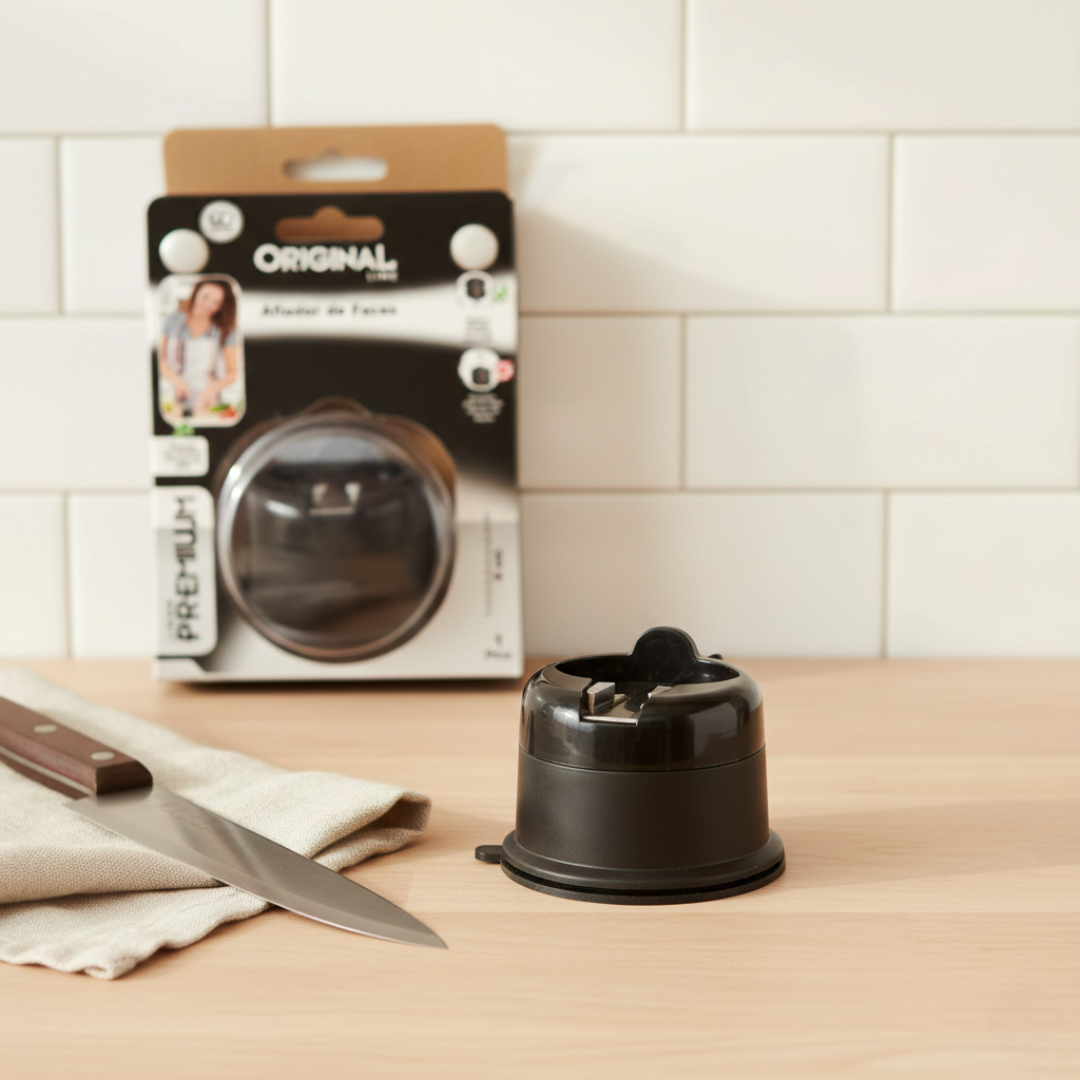 Mantenha suas facas sempre afiadas e prontas para qualquer receita com o afiador de facas ventosa Original Line Premium, a ferramenta compacta que garante cortes precisos com total segurança e facilidade, qualidade e resistencia.