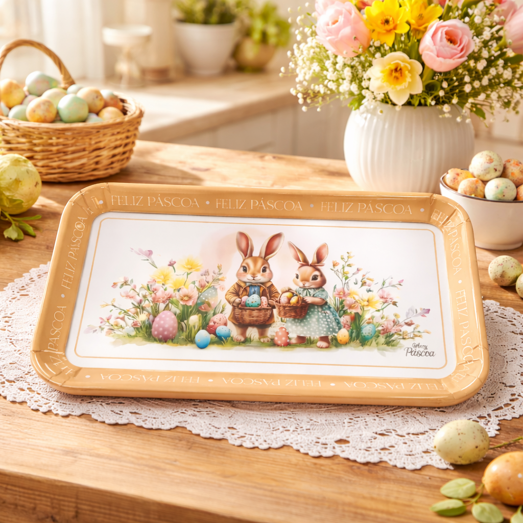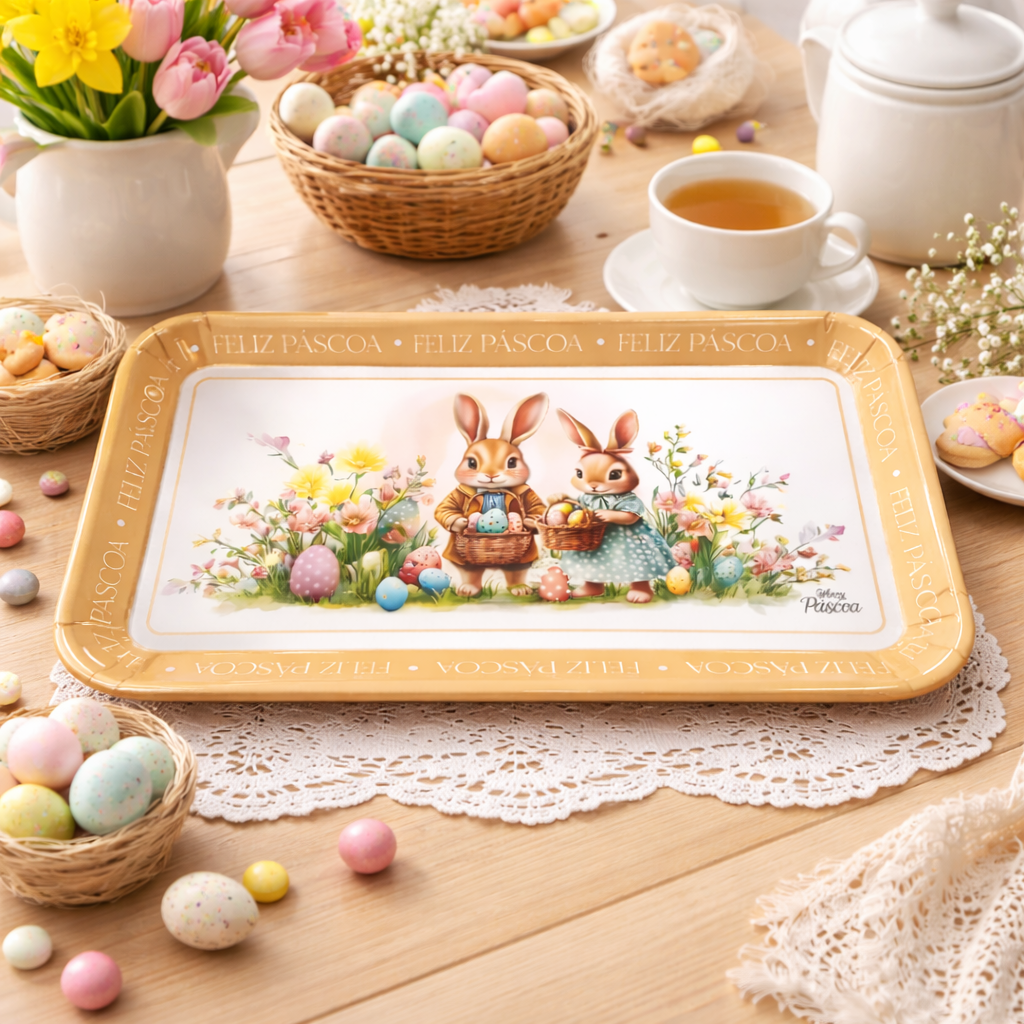 Versatilidade de Uso: Ideal como bandeja para servir bebidas, doces, ovos de chocolate ou compor a decoração da mesa posta.