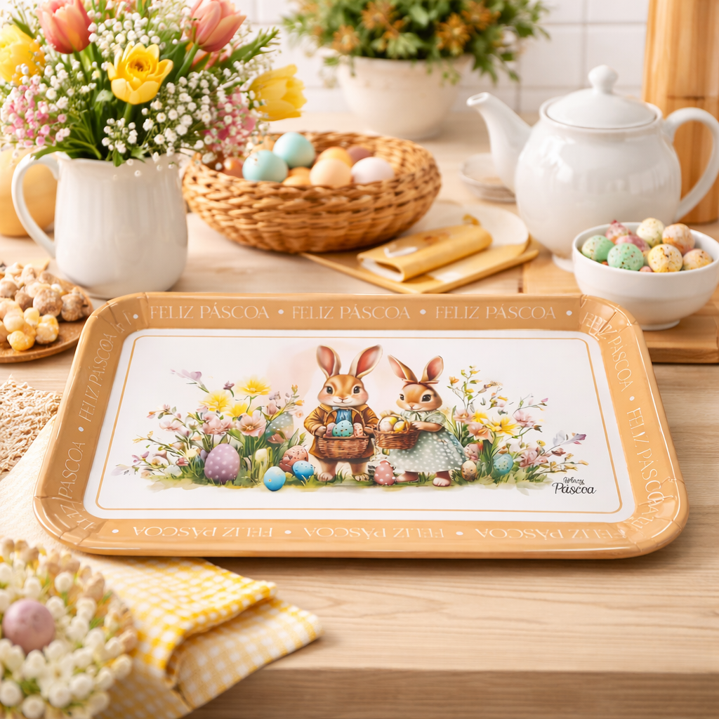 Design Temático Exclusivo: Estampa encantadora com coelhos e elementos florais que trazem o verdadeiro espírito da Páscoa.