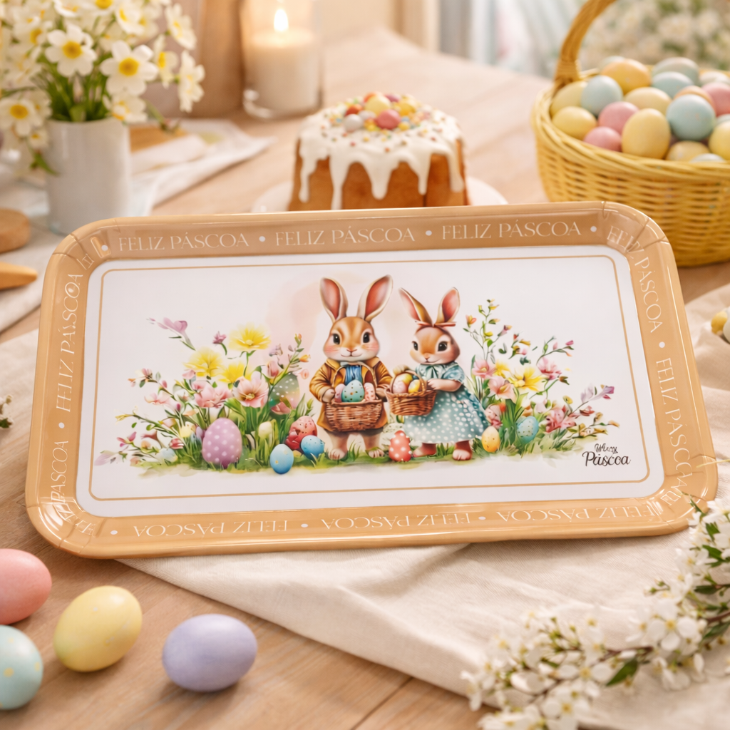A Bandeja Feliz Páscoa Melamina Wincy é perfeita para servir cafés, chás, doces e chocolates com charme e praticidade durante a celebração pascal. Produzida em melamina resistente, oferece leveza, durabilidade e fácil higienização, sendo ideal para uso doméstico em mesas de café da manhã, almoços especiais e decorações temáticas. Seu design delicado com coelhinhos e a borda decorada valorizam a apresentação dos alimentos, tornando cada momento ainda mais acolhedor e festivo. Além de funcional, a bandeja agrega beleza e organização à sua mesa de Páscoa.