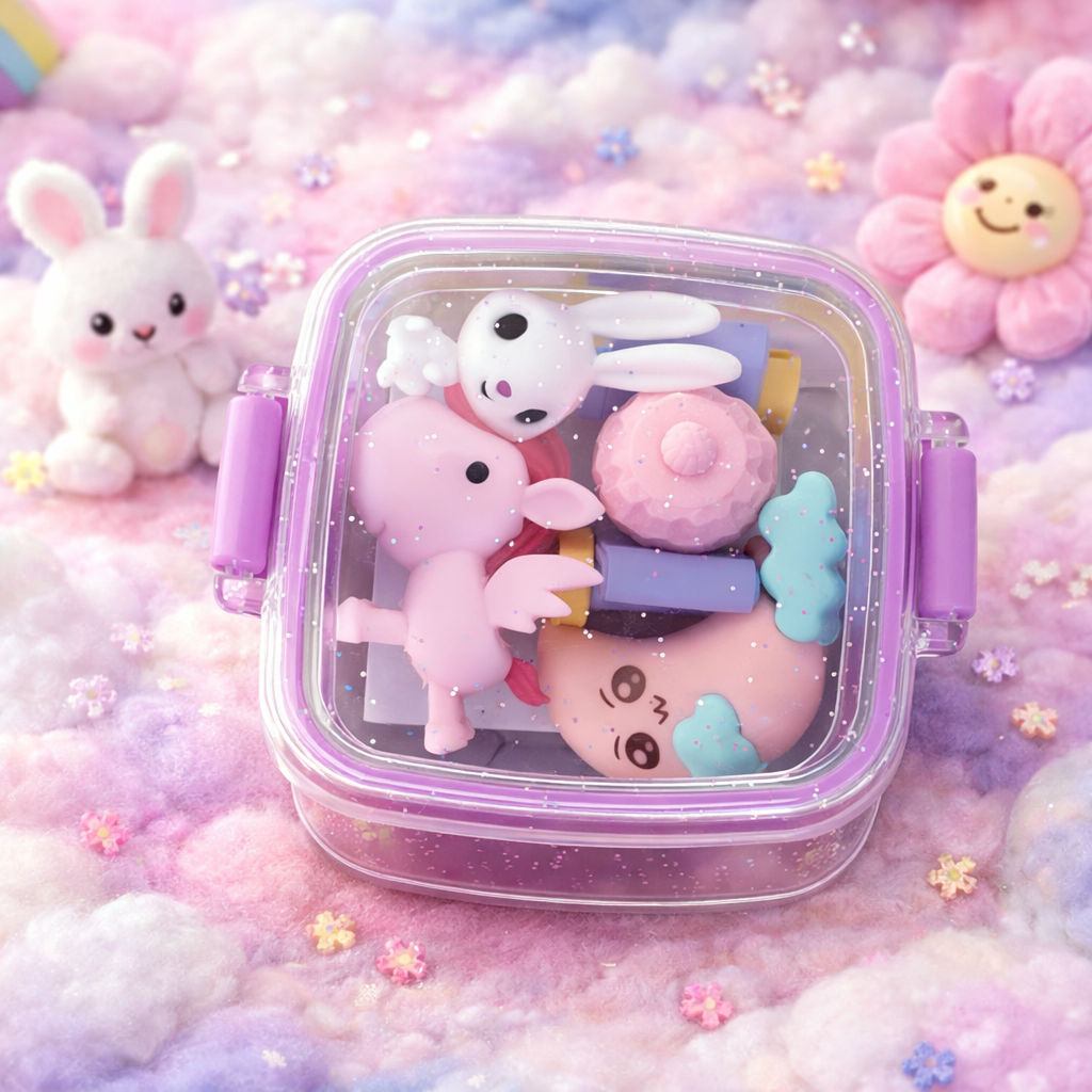 Produto (contém): 1 marmitinha plástica com borrachas temáticas coloridas