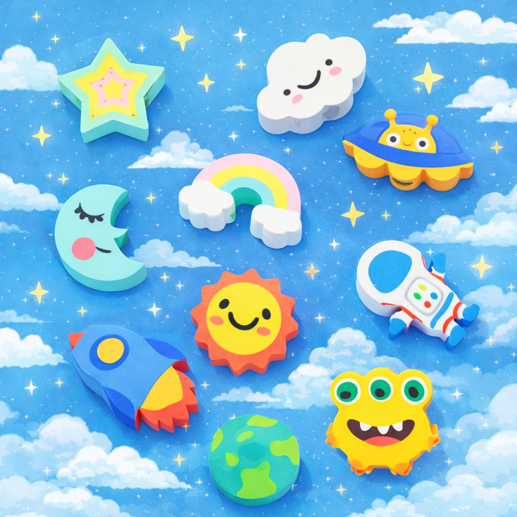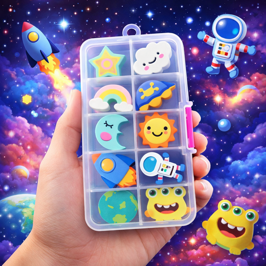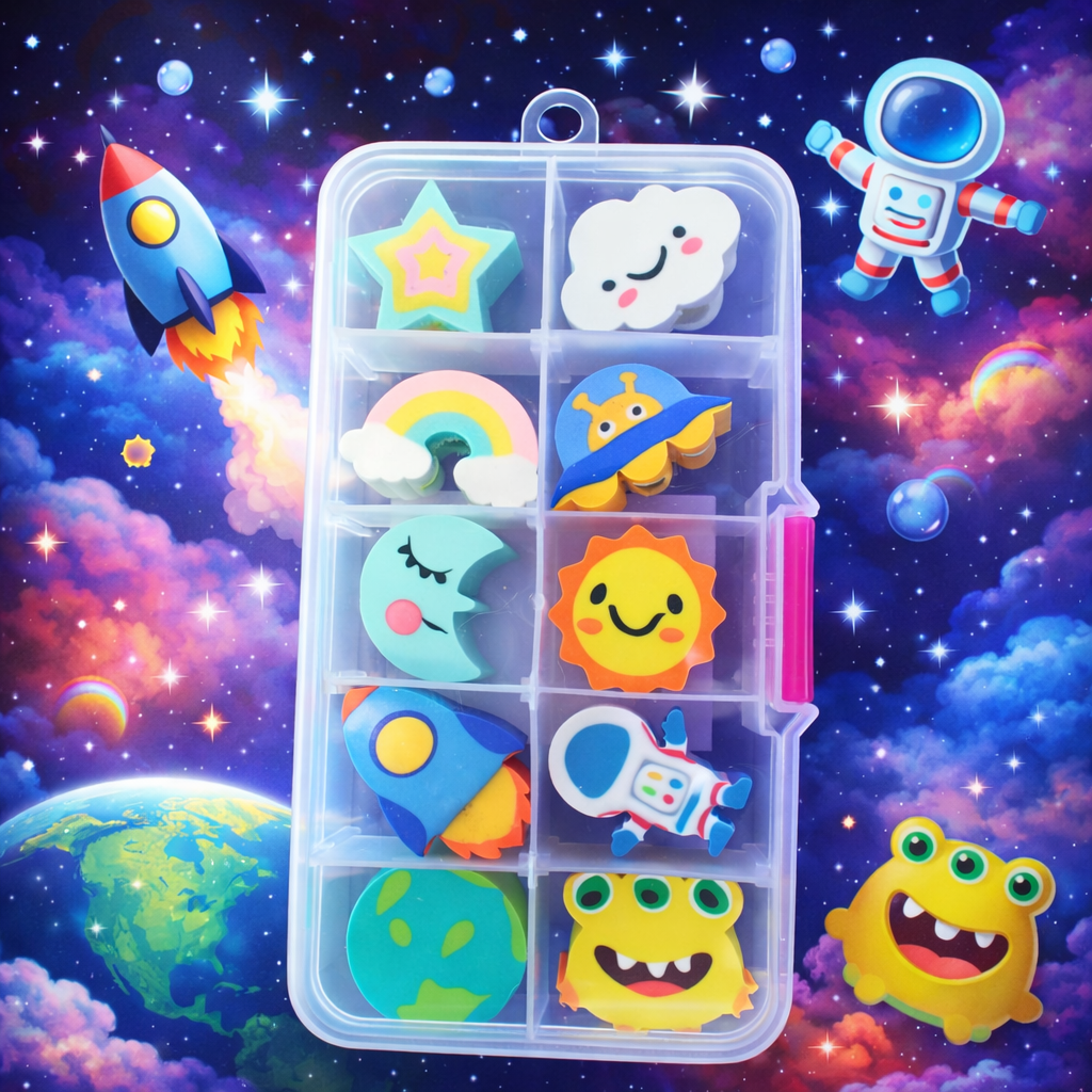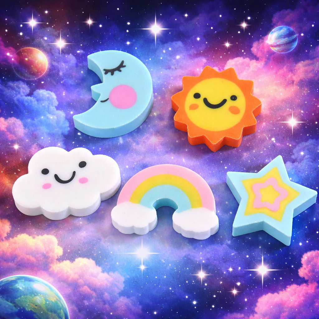 Design Espacial Divertido: Borrachas com formatos variados que estimulam a criatividade e tornam o uso mais atrativo.