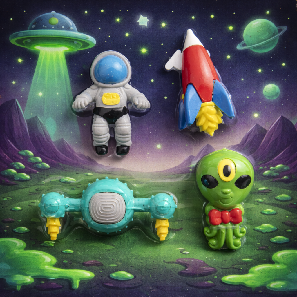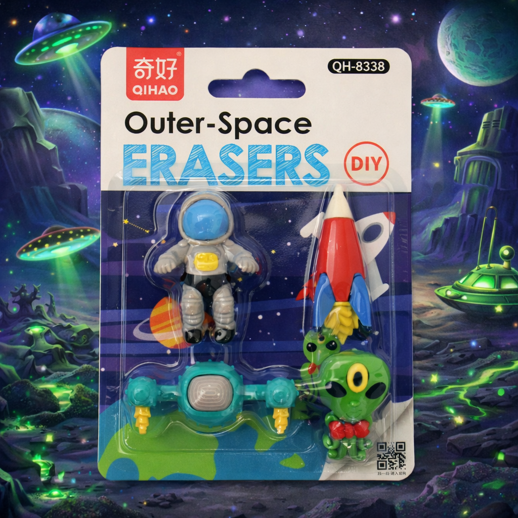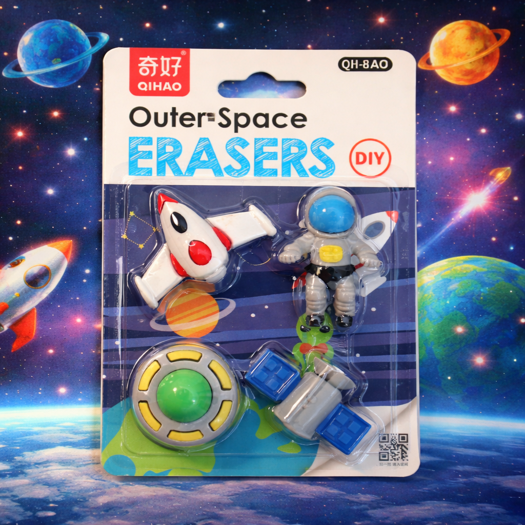 Produto (contém): 1 cartela com borrachas temáticas espaciais 3D