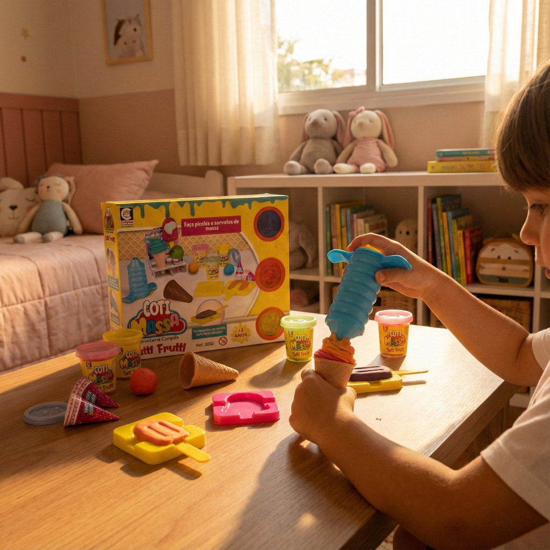 O grande diferencial do Brinquedo Coti Massa Tutti Frutti Sorveteria Cotiplás está no irresistível aroma de Tutti-Frutti, que transforma a brincadeira em uma experiência sensorial completa. O kit acompanha diversos acessórios, como moldes, espátulas, casquinhas e recipientes que simulam uma sorveteria de verdade, estimulando o faz-de-conta, a criatividade e a coordenação motora das crianças.