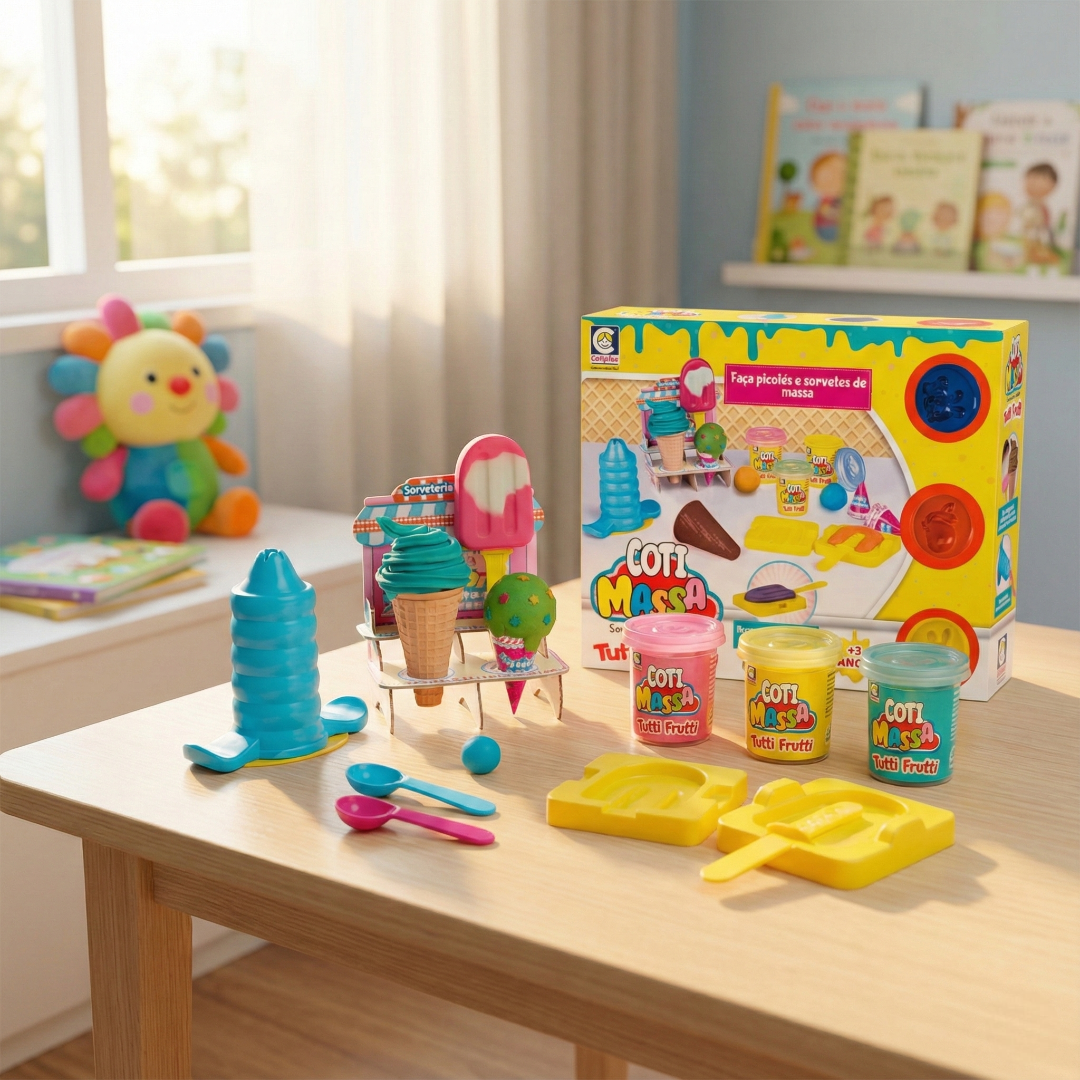 O Brinquedo Coti Massa Tutti Frutti Sorveteria é o passaporte perfeito para um mundo de diversão, cores e aromas deliciosos. Produzido pela tradicional marca Cotiplás, este kit convida as crianças a se tornarem verdadeiros mestres sorveteiros, criando casquinhas, copinhos e sundaes criativos com a massinha de modelar mais cheirosa do mercado.