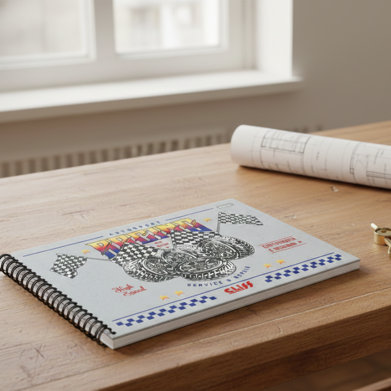 Espiral reforçado que permite a abertura total das páginas de desenho.