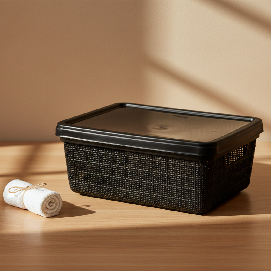 Compacta e versátil, esta caixa é ideal para guardar maquiagens, acessórios de escritório, cabos ou pequenos brinquedos. A caixa organizadora juta 5l possui aberturas discretas em seu design que permitem a ventilação interna, evitando mofo e odores em objetos guardados por muito tempo. Sua tampa foi projetada para permitir o empilhamento seguro, otimizando o espaço em prateleiras e armários. O acabamento na cor preta confere um ar moderno e sóbrio, permitindo que a caixa fique exposta em estantes ou banheiros como parte da composição do ambiente.