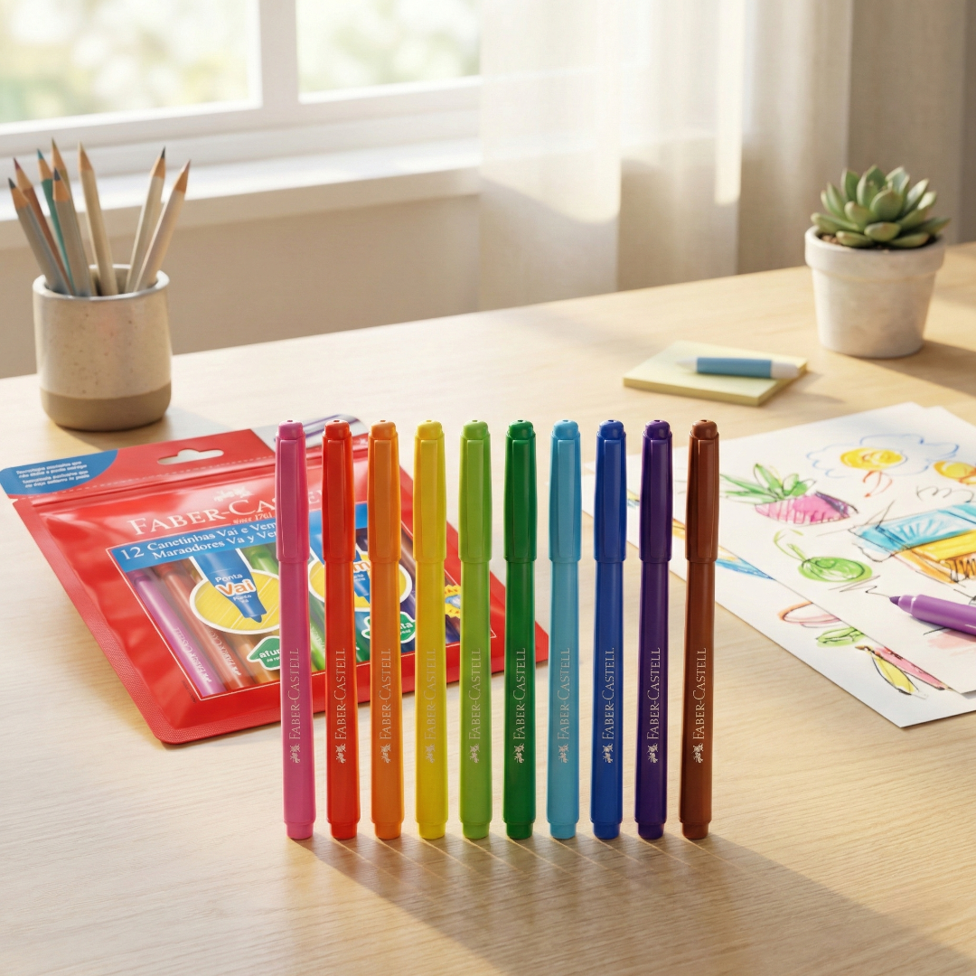 A alta performance da canetinha vai e vem 12 cores destaca-se pelo uso de materiais robustos e tecnologia de tinta lavável avançada, garantindo que a experiência no papel seja durável e totalmente livre de manchas permanentes na maioria dos tecidos. A marca Faber-Castell equipou esta figura com um sistema exclusivo que impede que a ponta afunde, permitindo um manuseio firme e seguro durante a pintura de grandes áreas ou pequenos detalhes por mãos iniciantes. Cada item acompanha uma estrutura com tampa antiasfixiante que distribui a segurança de forma homogênea, enriquecendo o acabamento das tarefas e estimulando uma rotina mais saudável e criativa para os pequenos artistas. É o presente ideal para quem deseja renovar o acervo de materiais de pintura com brilho e carisma técnicos superiores.