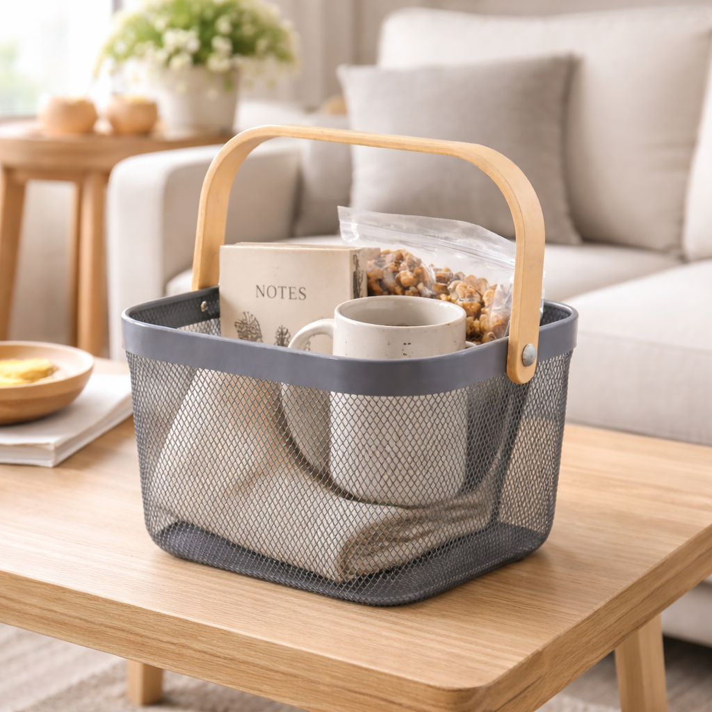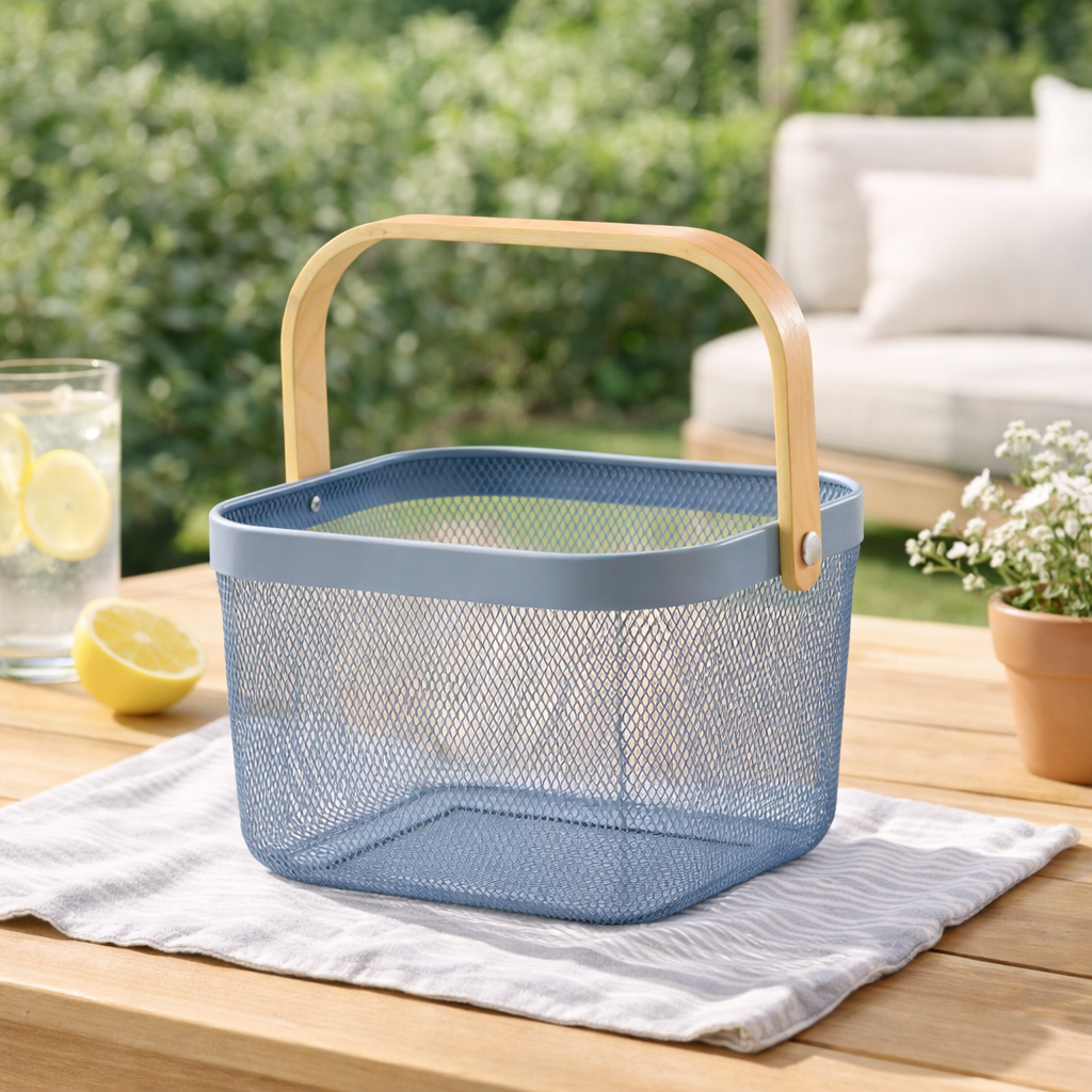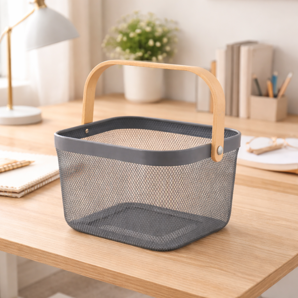 Cesto Organizador de Metal 18x24x24cm é a solução ideal para quem busca organização funcional aliada a um design moderno e elegante. Produzido em metal aramado resistente, permite excelente ventilação dos itens armazenados, evitando acúmulo de poeira e facilitando a visualização do conteúdo. Seu formato versátil possibilita o uso em diversos ambientes, como cozinha, escritório, lavanderia, banheiro ou área gourmet. A alça em madeira oferece um toque natural e sofisticado, além de facilitar o transporte no dia a dia. Disponível nas cores cinza ou azul, este cesto combina facilmente com diferentes estilos de decoração, tornando-se um item prático e decorativo ao mesmo tempo. Ideal para organizar utensílios, alimentos, materiais de escritório, produtos de limpeza ou objetos diversos, é uma escolha inteligente para manter tudo sempre em ordem com charme e eficiência.
