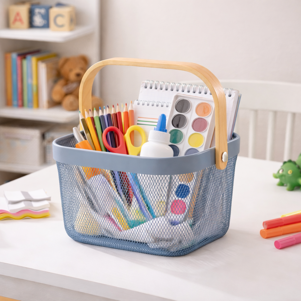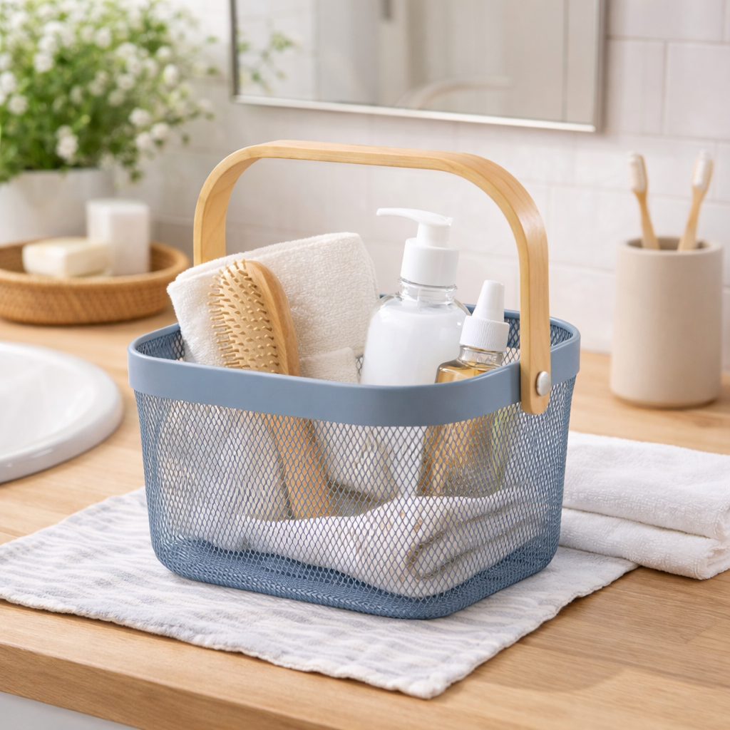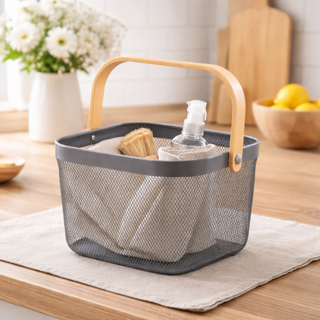 Cesto Organizador de Metal 18x24x24cm é a solução ideal para quem busca organização funcional aliada a um design moderno e elegante. Produzido em metal aramado resistente, permite excelente ventilação dos itens armazenados, evitando acúmulo de poeira e facilitando a visualização do conteúdo. Seu formato versátil possibilita o uso em diversos ambientes, como cozinha, escritório, lavanderia, banheiro ou área gourmet. A alça em madeira oferece um toque natural e sofisticado, além de facilitar o transporte no dia a dia. Disponível nas cores cinza ou azul, este cesto combina facilmente com diferentes estilos de decoração, tornando-se um item prático e decorativo ao mesmo tempo. Ideal para organizar utensílios, alimentos, materiais de escritório, produtos de limpeza ou objetos diversos, é uma escolha inteligente para manter tudo sempre em ordem com charme e eficiência.