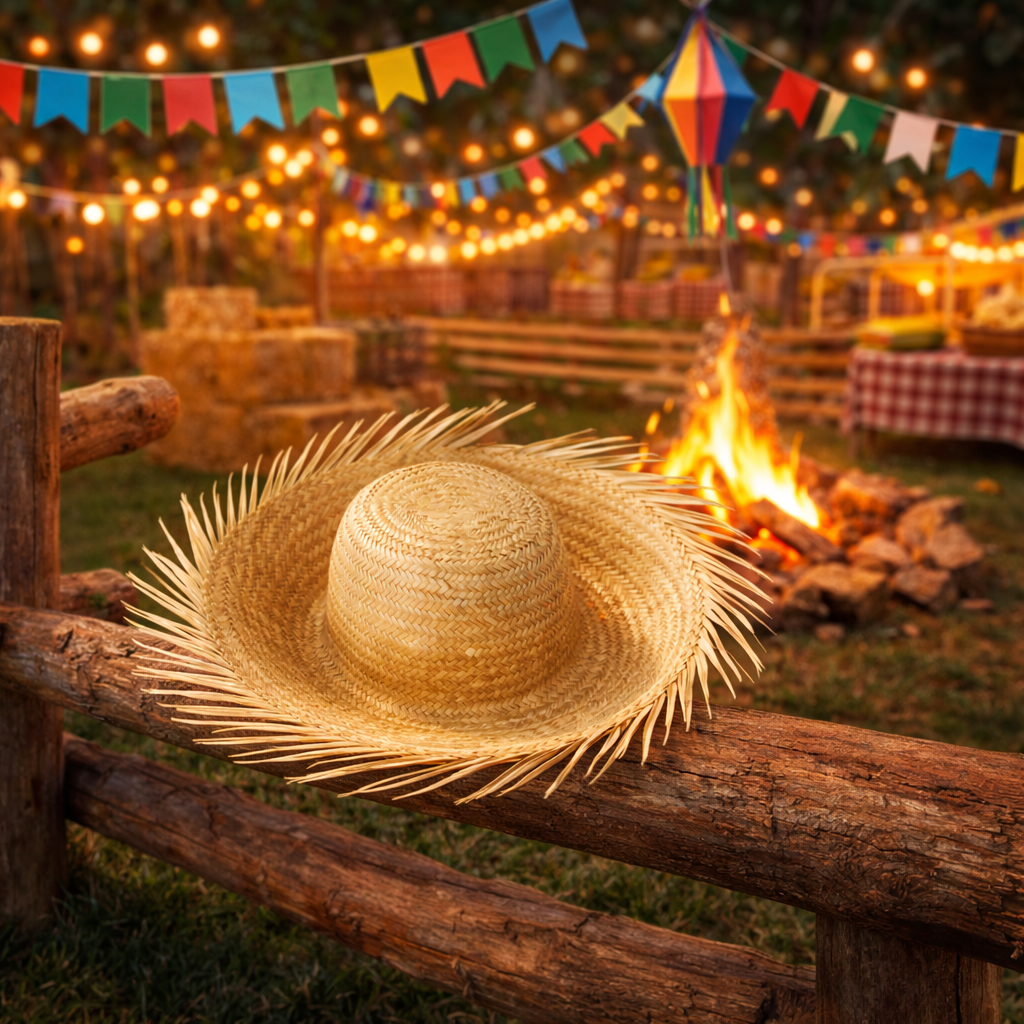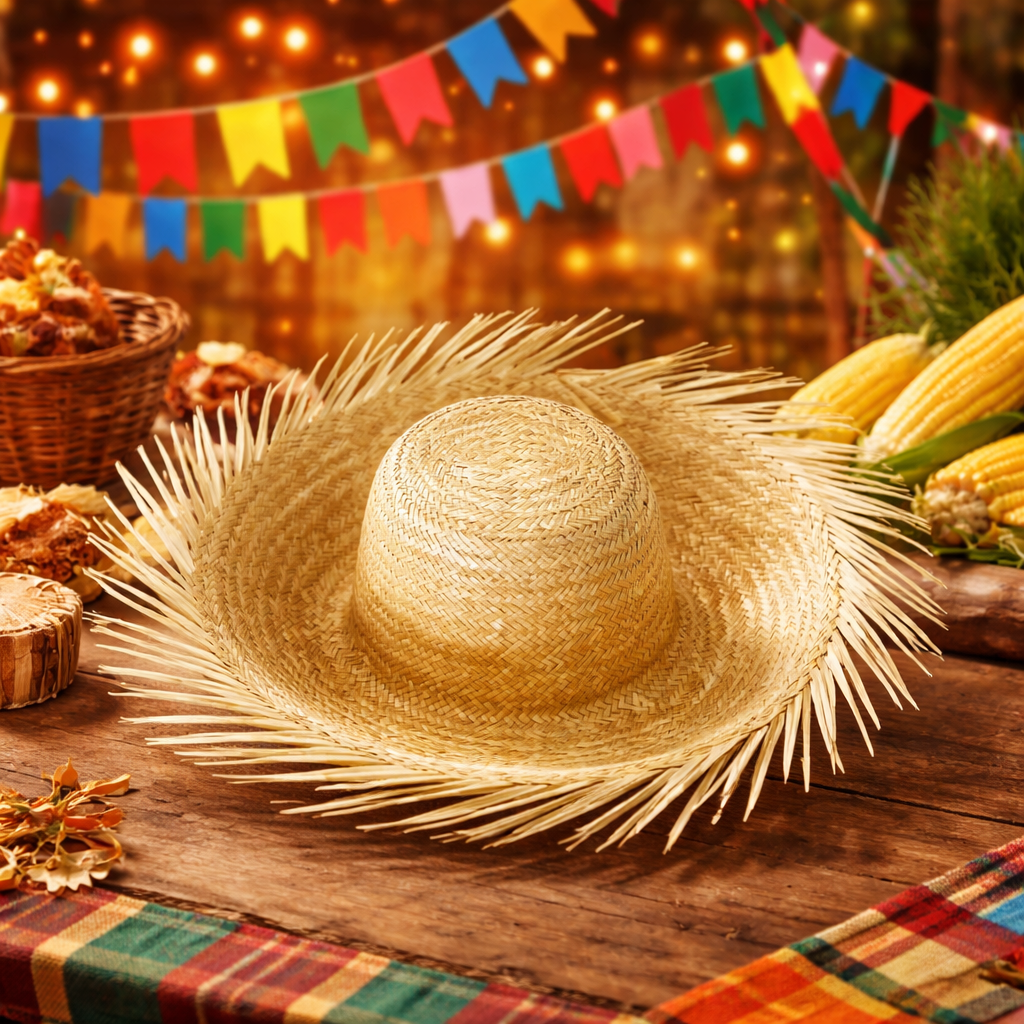 Autenticidade Garantida: O Chapéu Caipira de Palha Desfiado complementa o look típico com originalidade.