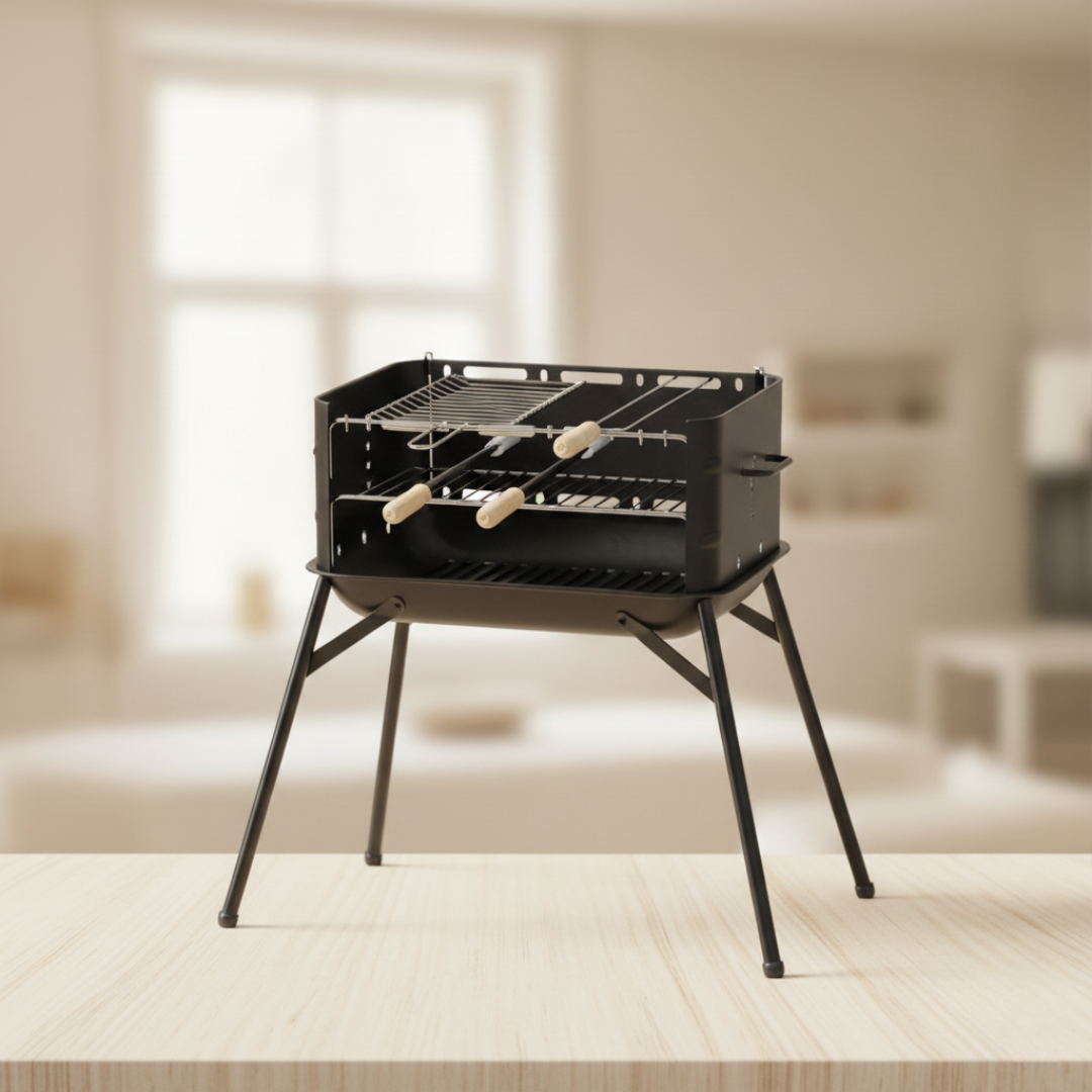 Kit Completo: Já acompanha 01 grelha, 02 espetos simples de 48cm e 01 espeto duplo de 48cm.