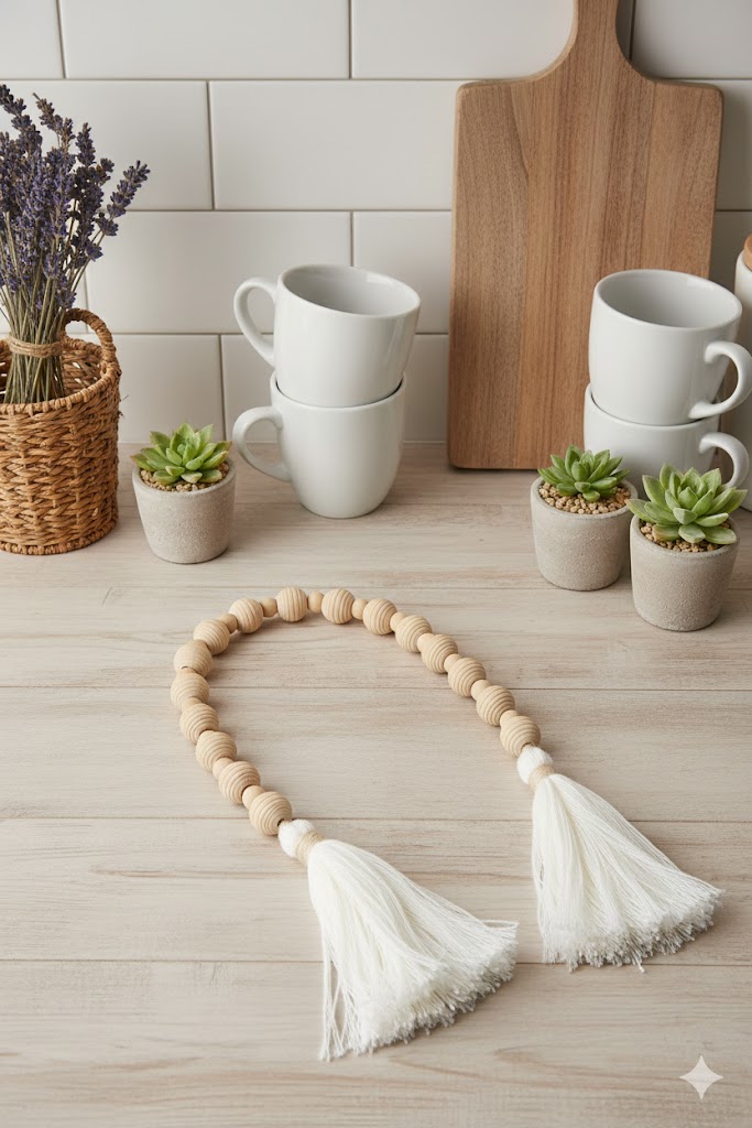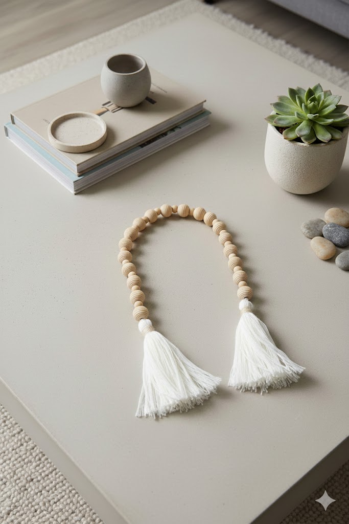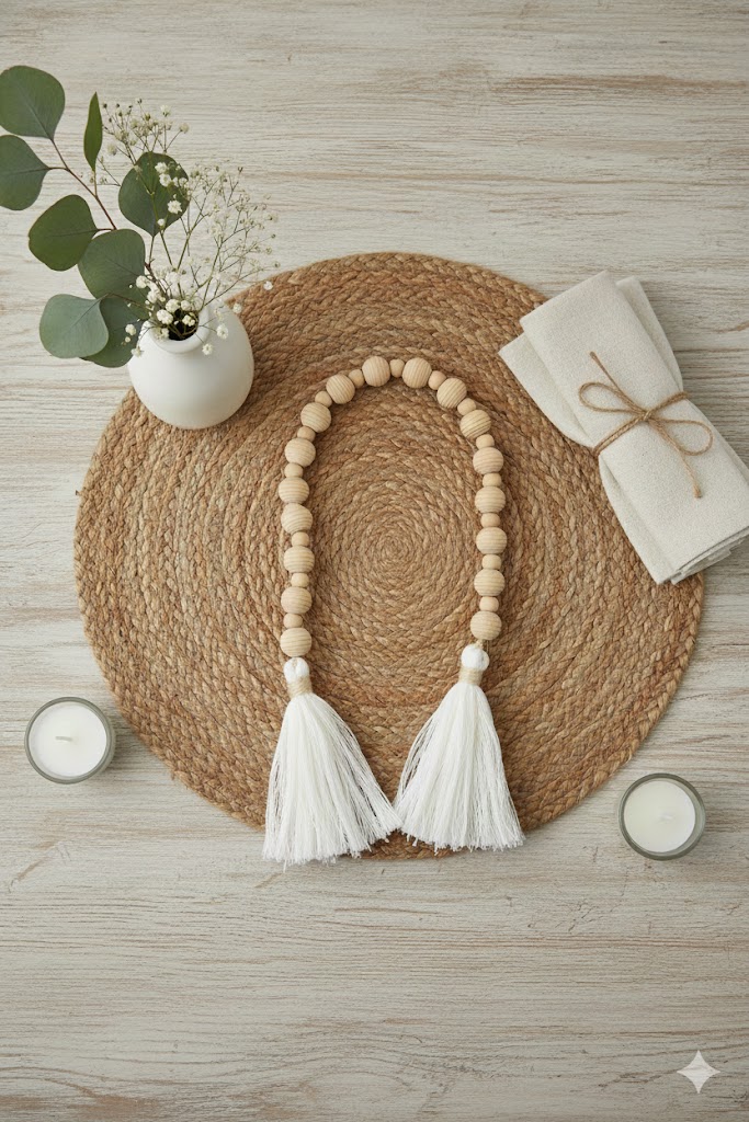 Materiais Naturais: Produzido com contas decorativas em madeira e tassels em algodão, garantindo visual orgânico e elegante.