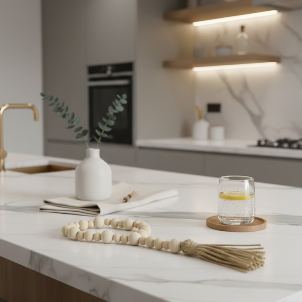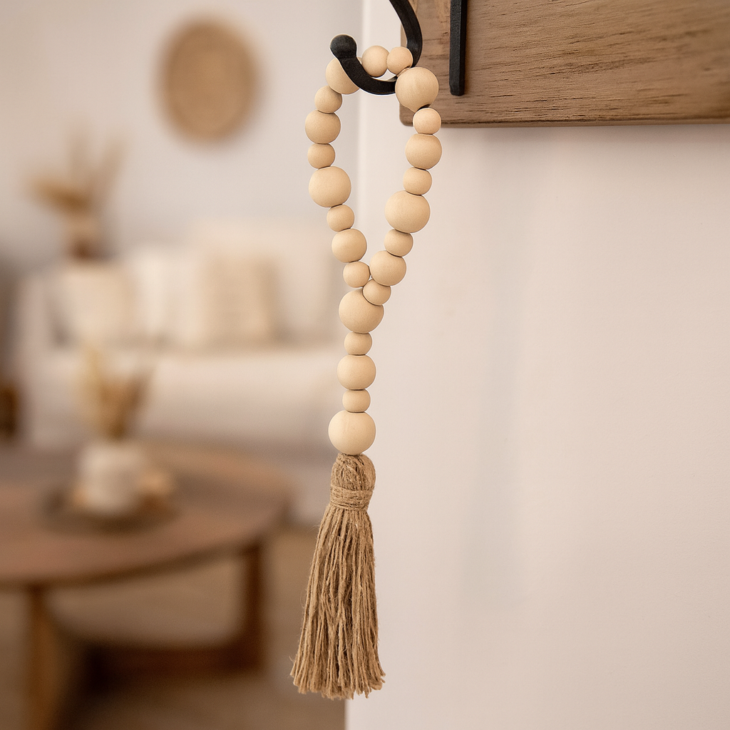 Design Artesanal: Contas uniformes e cordão trançado criam estética equilibrada e acolhedora.