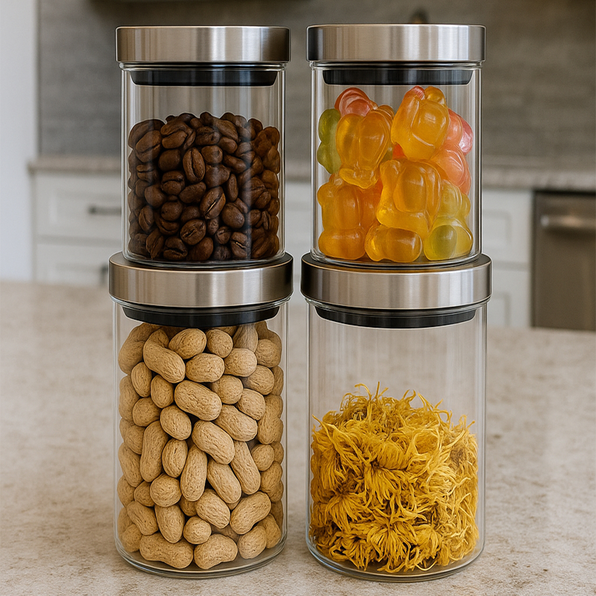 O conjunto é composto por 2 potes de 600 ml (9,5 cm de diâmetro x 11 cm de altura) e 2 potes de 950 ml (9,5 cm de diâmetro x 16 cm de altura), oferecendo tamanhos ideais para armazenar desde grãos e farinhas até biscoitos, temperos e snacks.