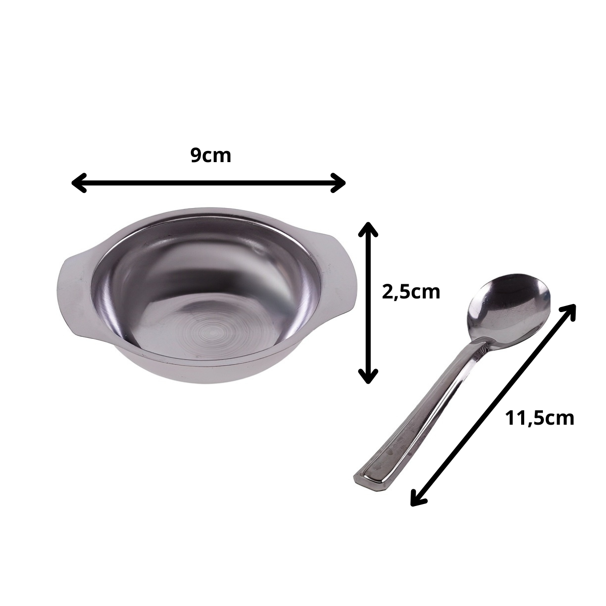 Dimensões do produto: Tigelas 9,5 cm (largura) x 3 cm (altura) | Colheres 11,5 cm