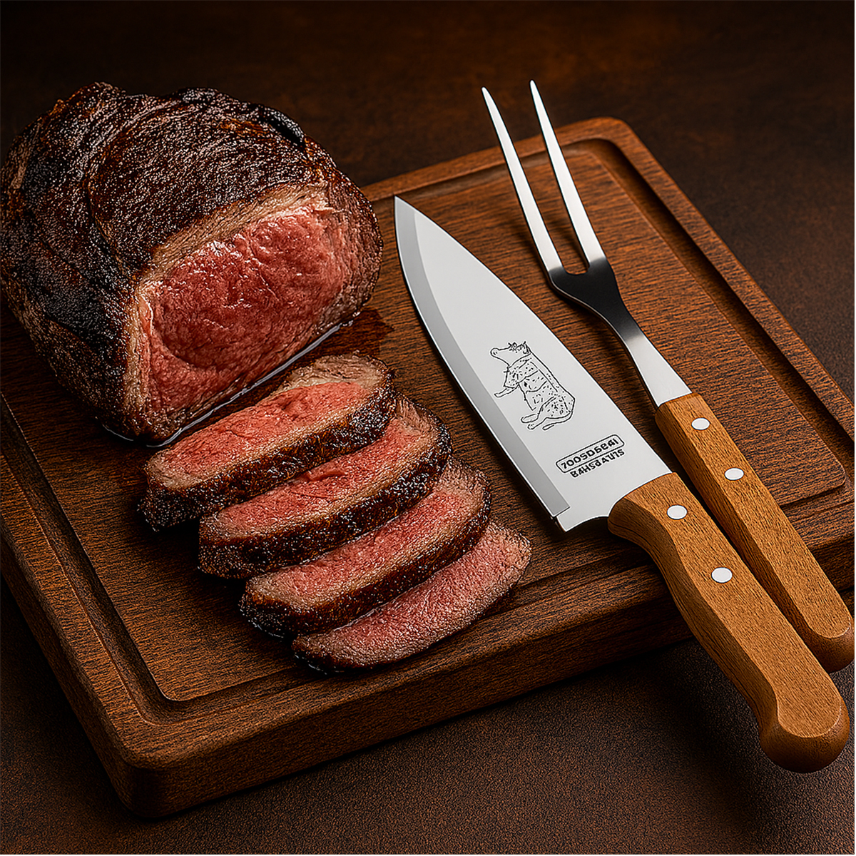 Este conjunto é composto por duas peças essenciais: uma faca de 8 polegadas e um garfo trinchante. Ambos são produzidos em aço inoxidável de alta qualidade, material que garante maior resistência ao uso contínuo e cortes precisos em diferentes tipos de carne;