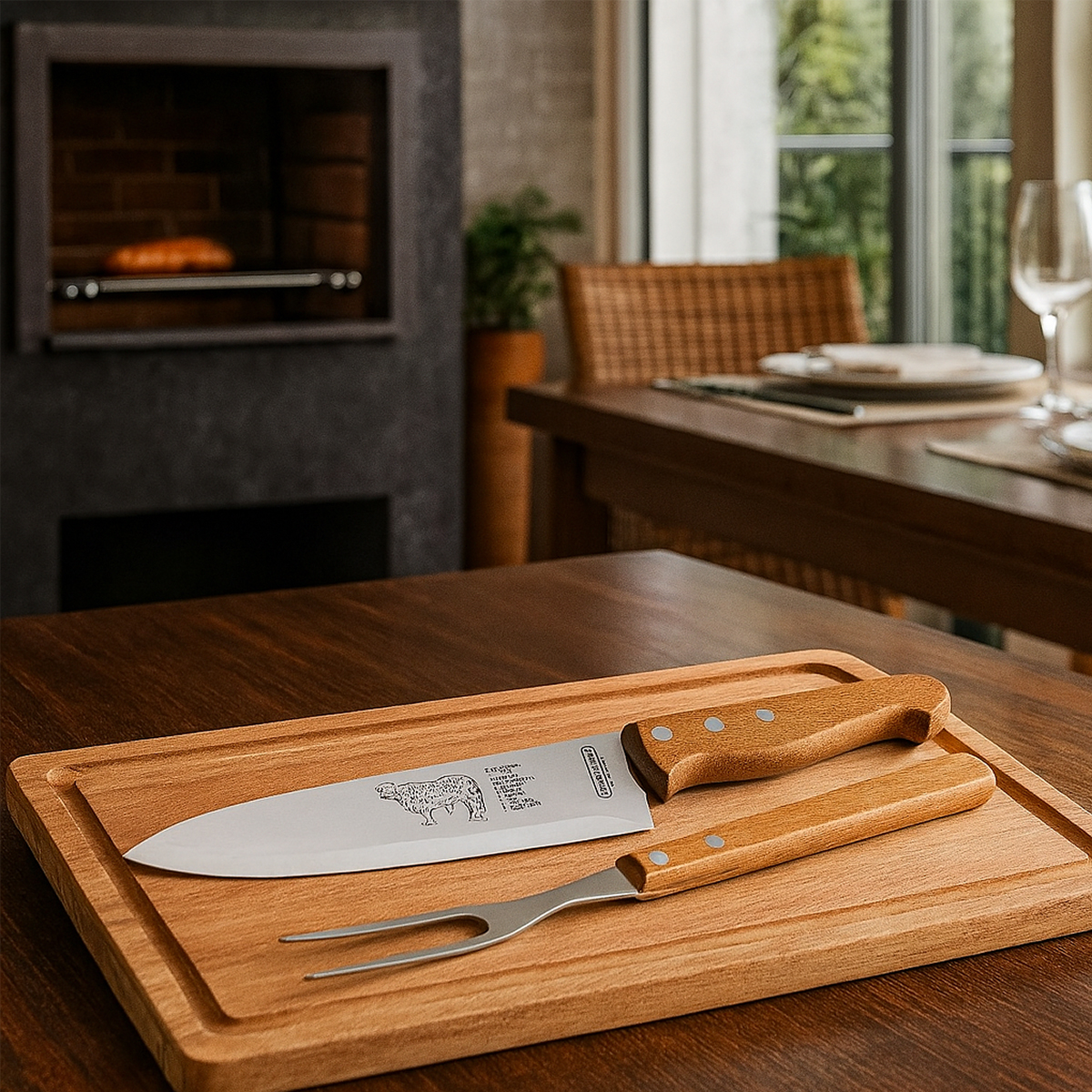 Complete a experiência do seu churrasco com o Conjunto Trinchante Tramontina Linha Dynamic, perfeito para quem valoriza praticidade, durabilidade e um toque rústico à mesa;