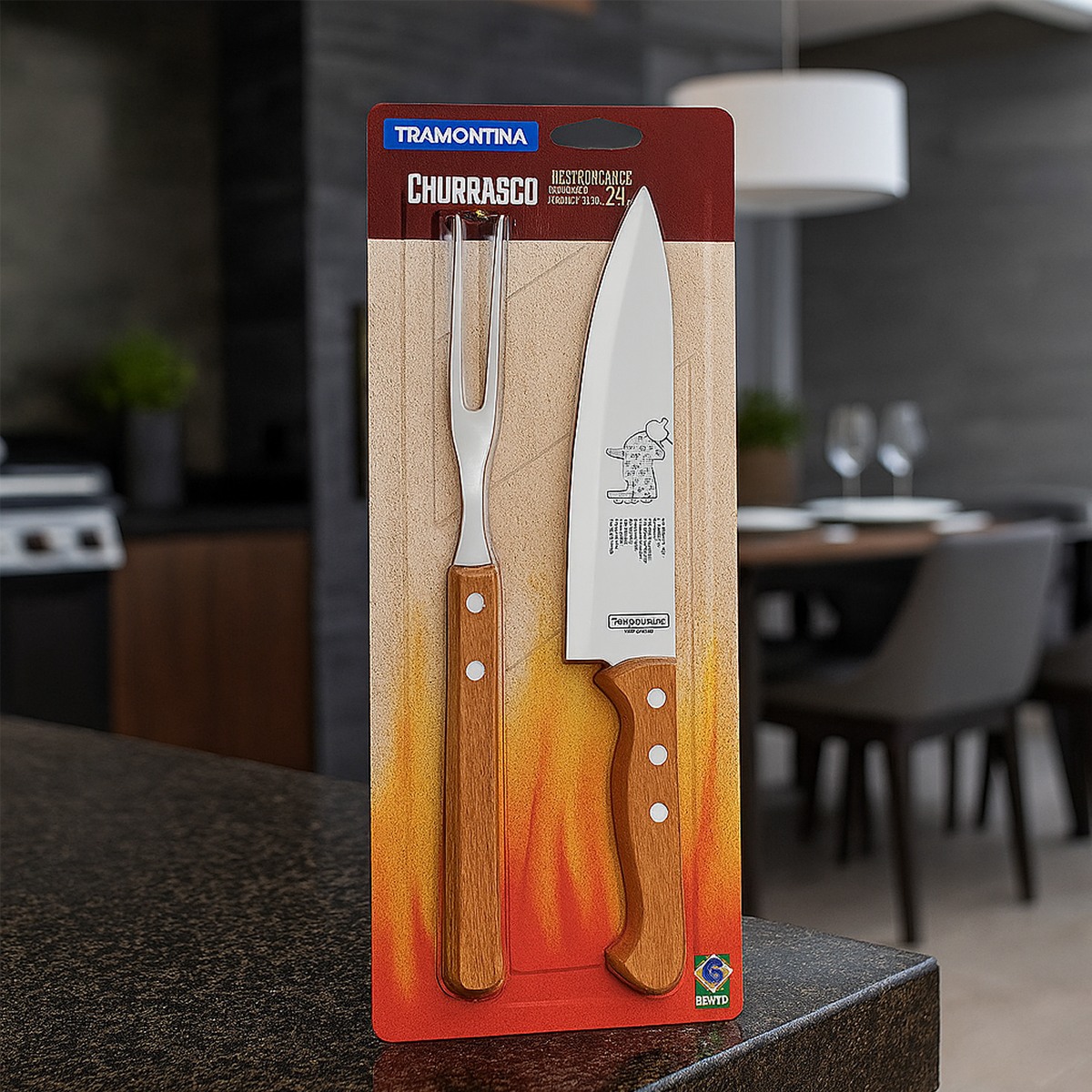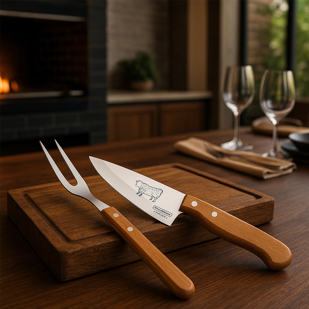 Conjunto Trinchante Churrasco 2 Peças Tramontina – Faca e garfo em aço inox com cabos de madeira natural para servir carnes com praticidade, resistência e elegância.