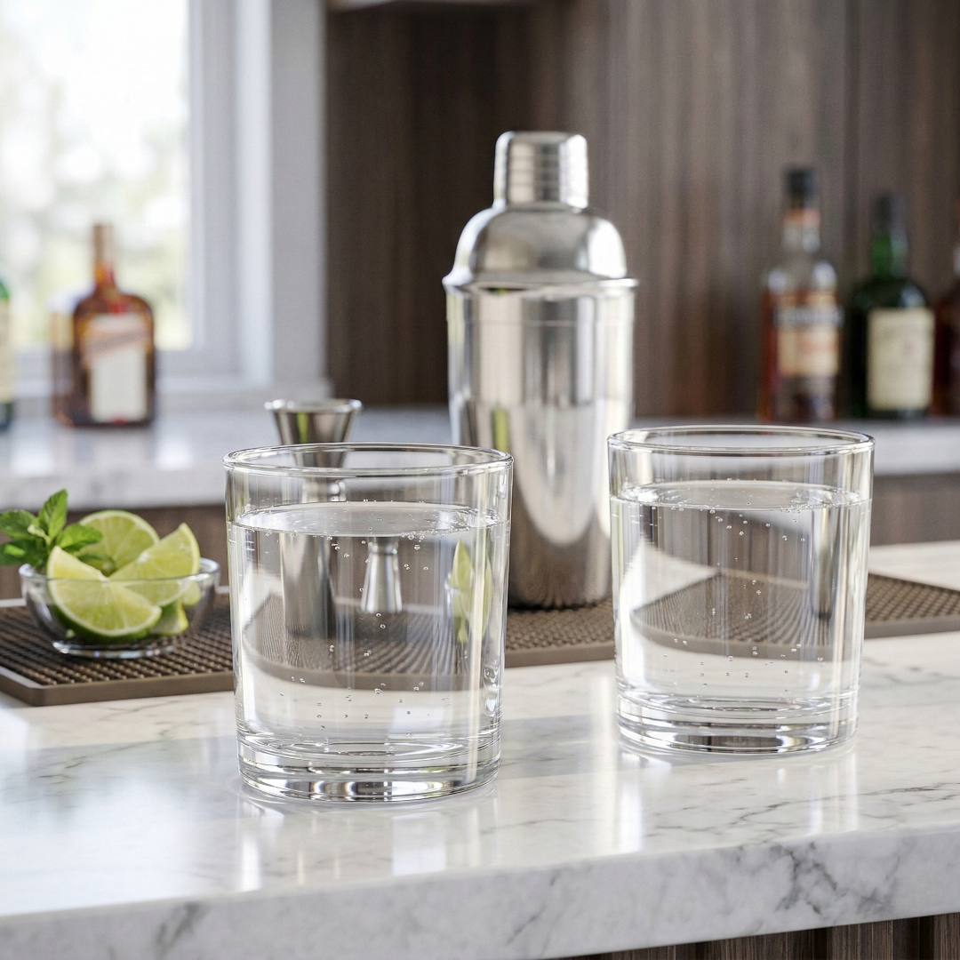 Vidro de alta transparência que valoriza a apresentação das bebidas.