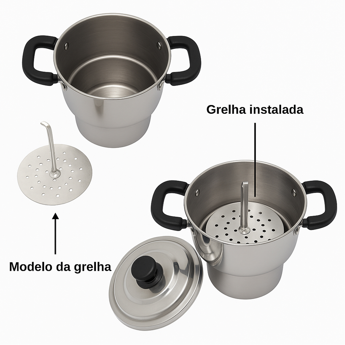 A Cuscuzeira Redar acompanha todas as partes essenciais para o preparo correto do cuscuz, desde a base até o compartimento perfurado, garantindo a tradição do cozimento a vapor, que preserva os nutrientes e o sabor do alimento;