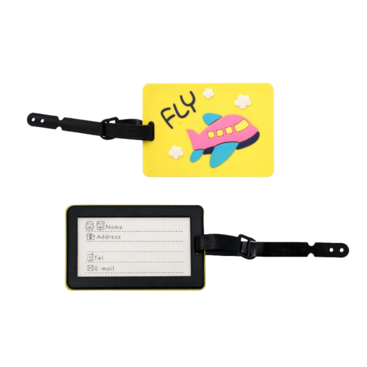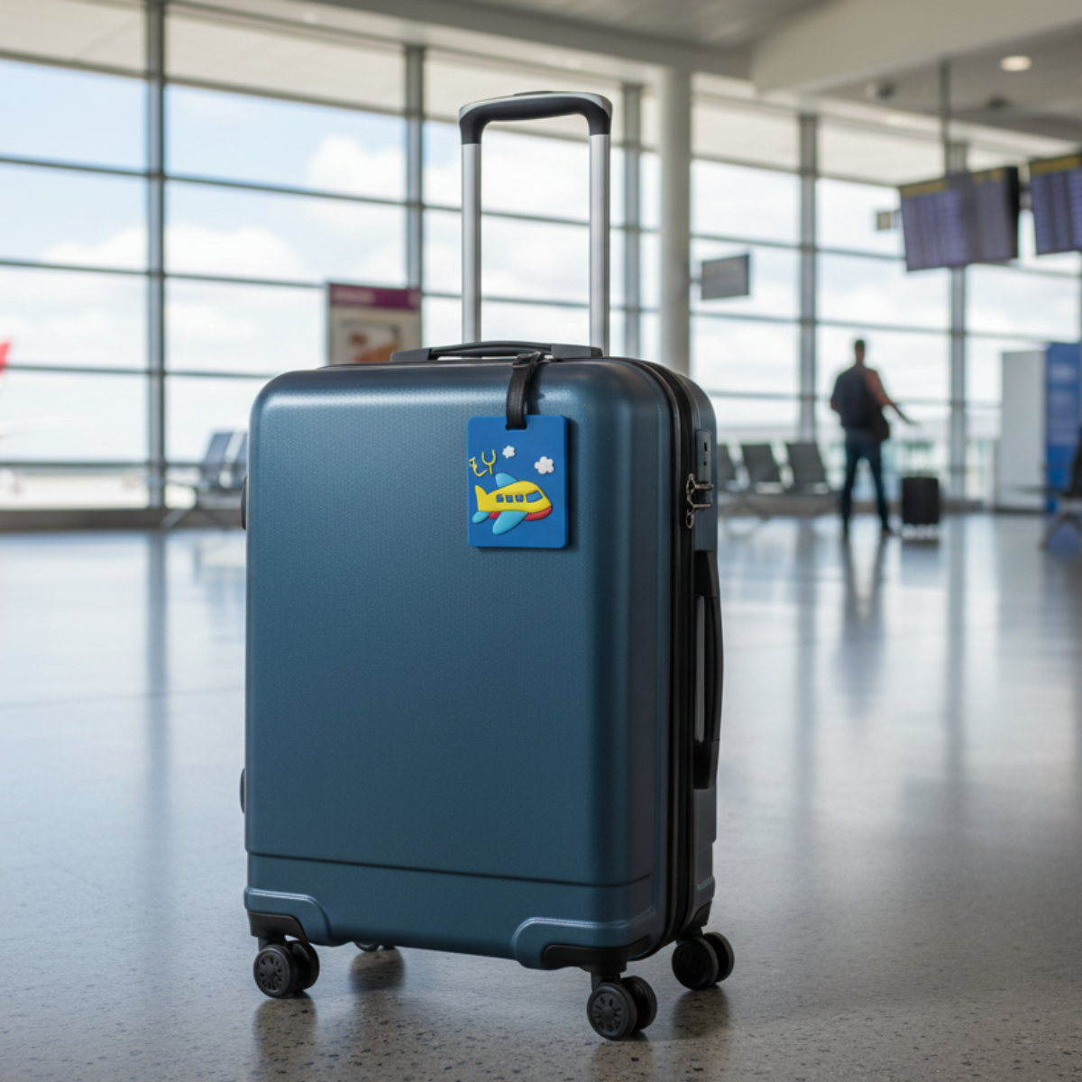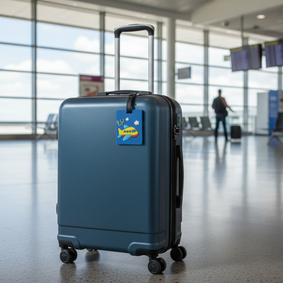 Design Funcional: A Etiqueta de Identificação de Mala possui visual atrativo que facilita o reconhecimento rápido da bagagem.