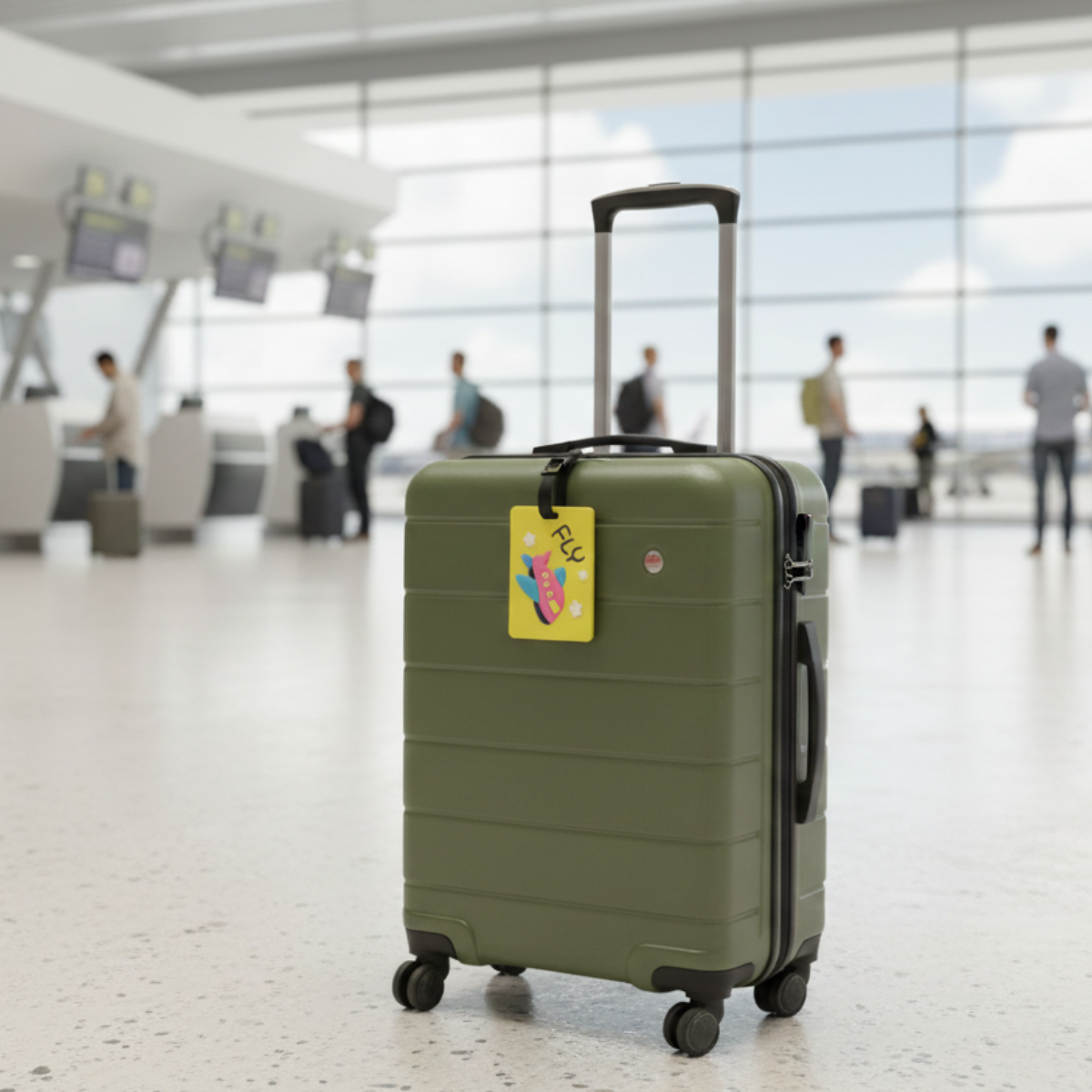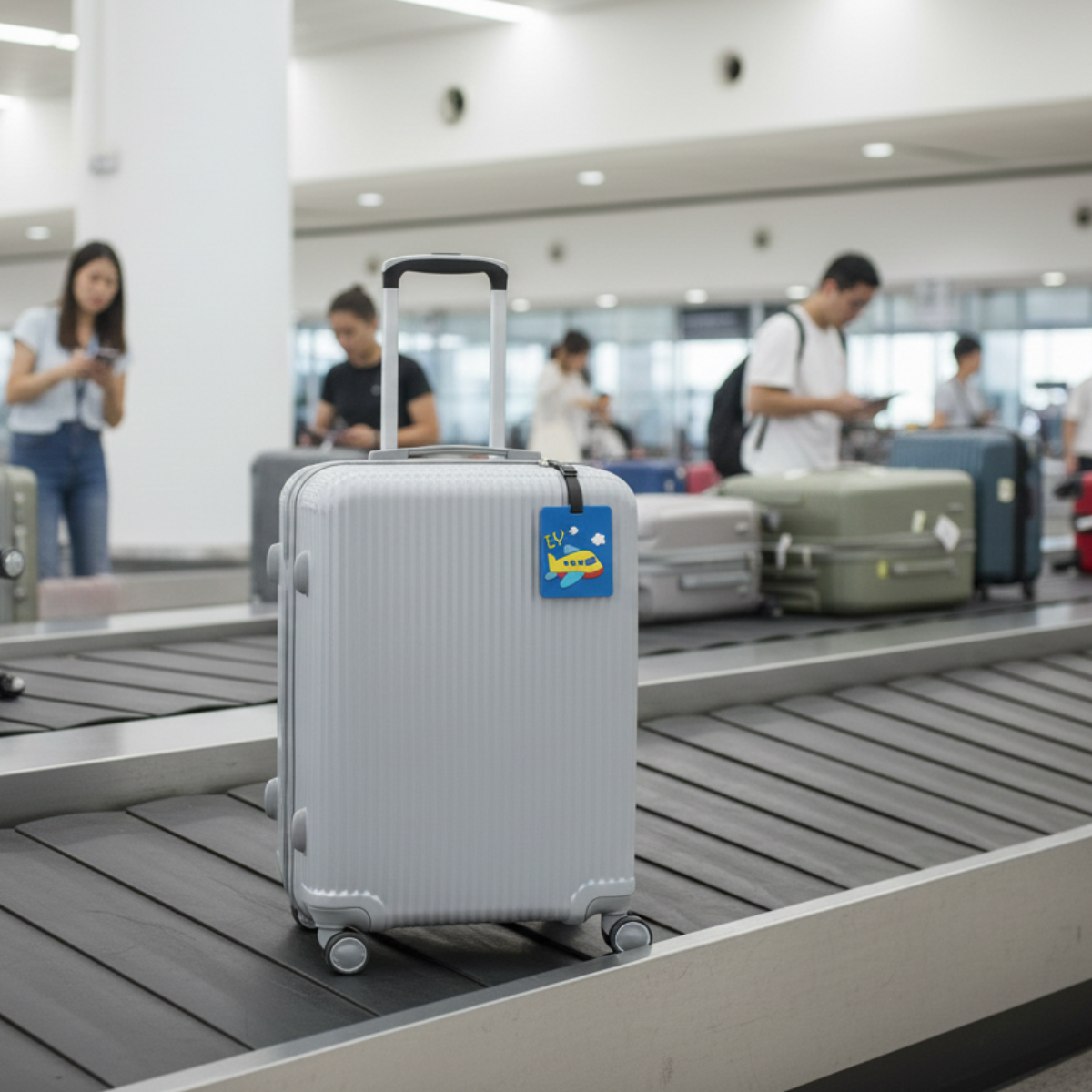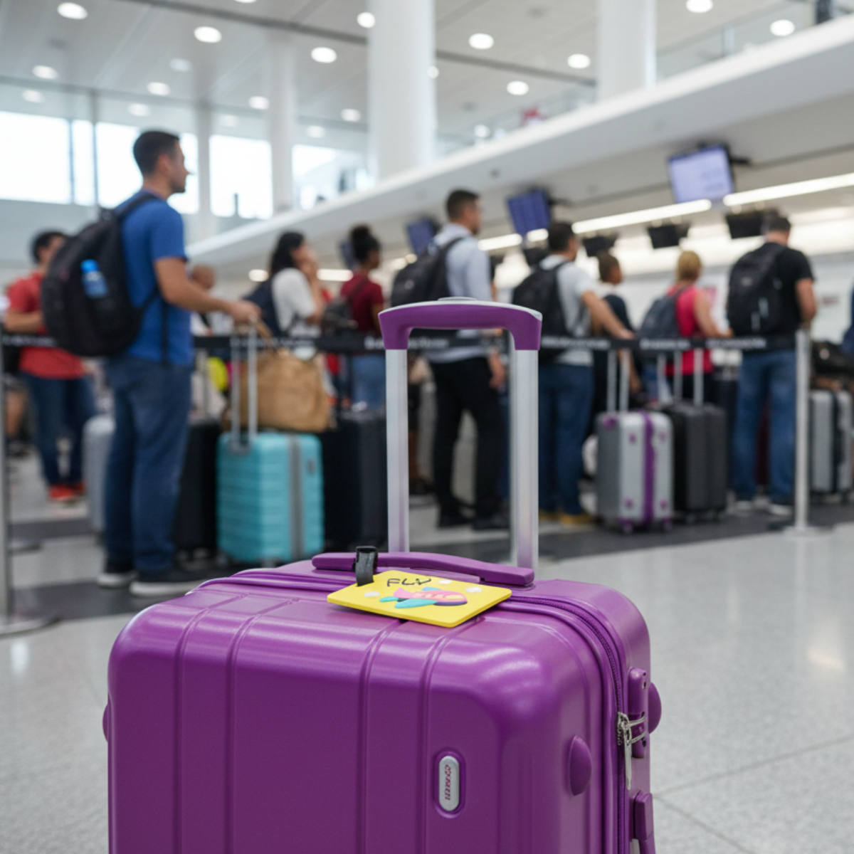 Design Funcional: A Etiqueta de Identificação de Mala possui visual atrativo que facilita o reconhecimento rápido da bagagem.