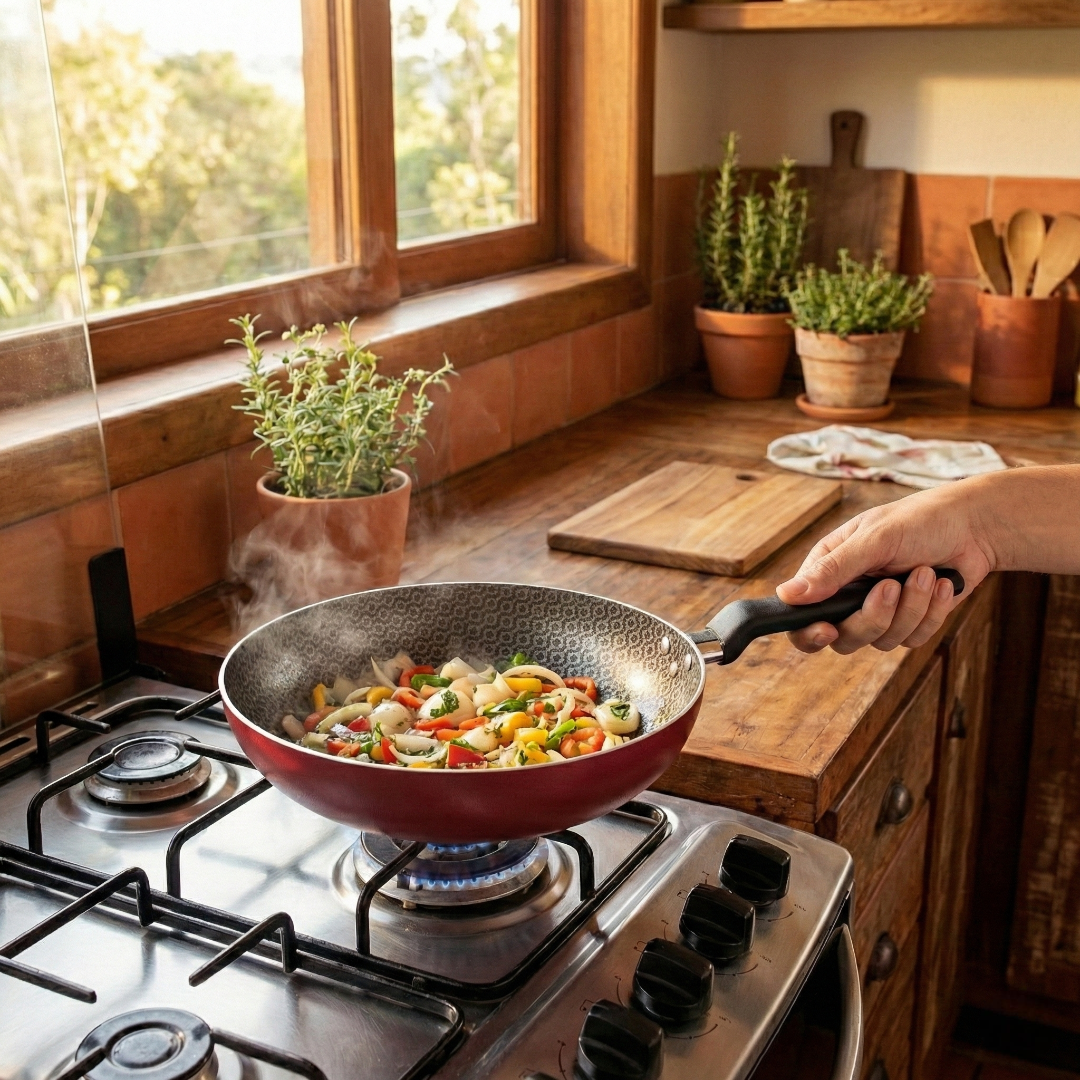 Prepare refeições incríveis e saborosas para toda a família com a extrema praticidade da frigideira antiaderente funda Vermelha. Ela é o utensílio indispensável para quem busca versatilidade e eficiência na cozinha, permitindo cozinhar grandes porções de molhos, carnes ou legumes de forma muito mais rápida e uniforme no dia a dia, sem complicações.