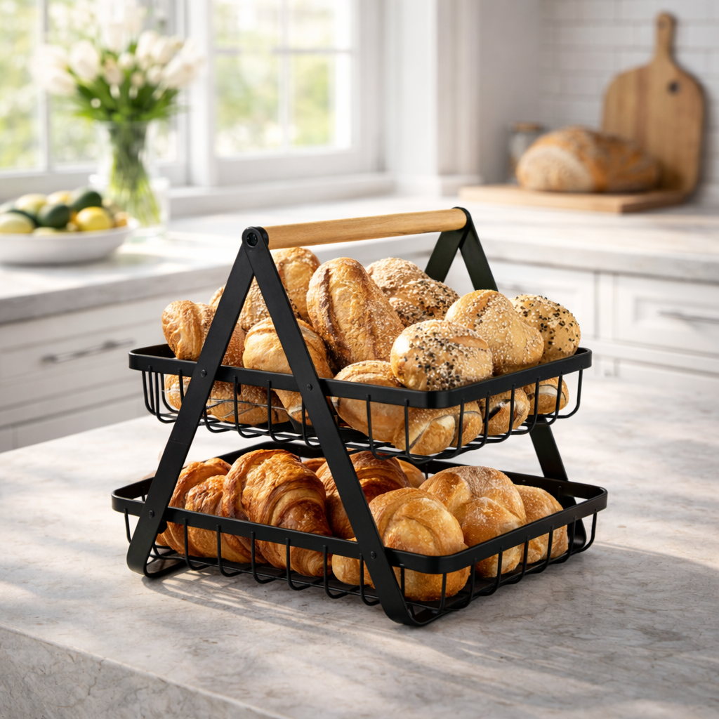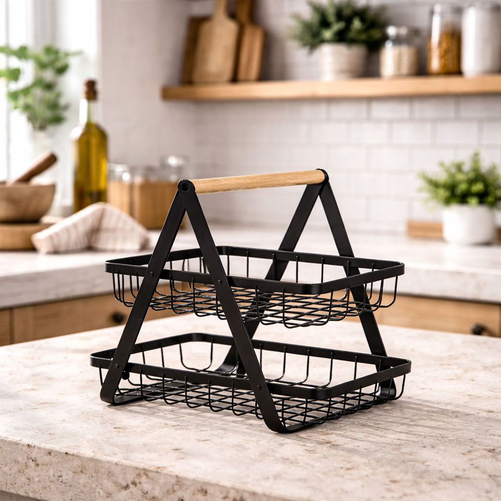 Fruteira de Mesa 2 Andares Ferro é a solução ideal para quem busca organização, praticidade e um toque moderno na decoração da cozinha. Produzida em ferro resistente com acabamento preto fosco, essa fruteira alia durabilidade e estilo industrial, mantendo frutas, legumes e até pães sempre visíveis e bem ventilados. Seu design em dois níveis otimiza o espaço da bancada, facilitando o acesso aos alimentos no dia a dia. A alça superior em madeira natural permite transportar a fruteira com facilidade, tornando-a funcional tanto para servir quanto para organizar. Versátil, pode ser utilizada também em áreas gourmet, mesas de apoio ou despensas, garantindo organização eficiente e estética sofisticada em qualquer ambiente.