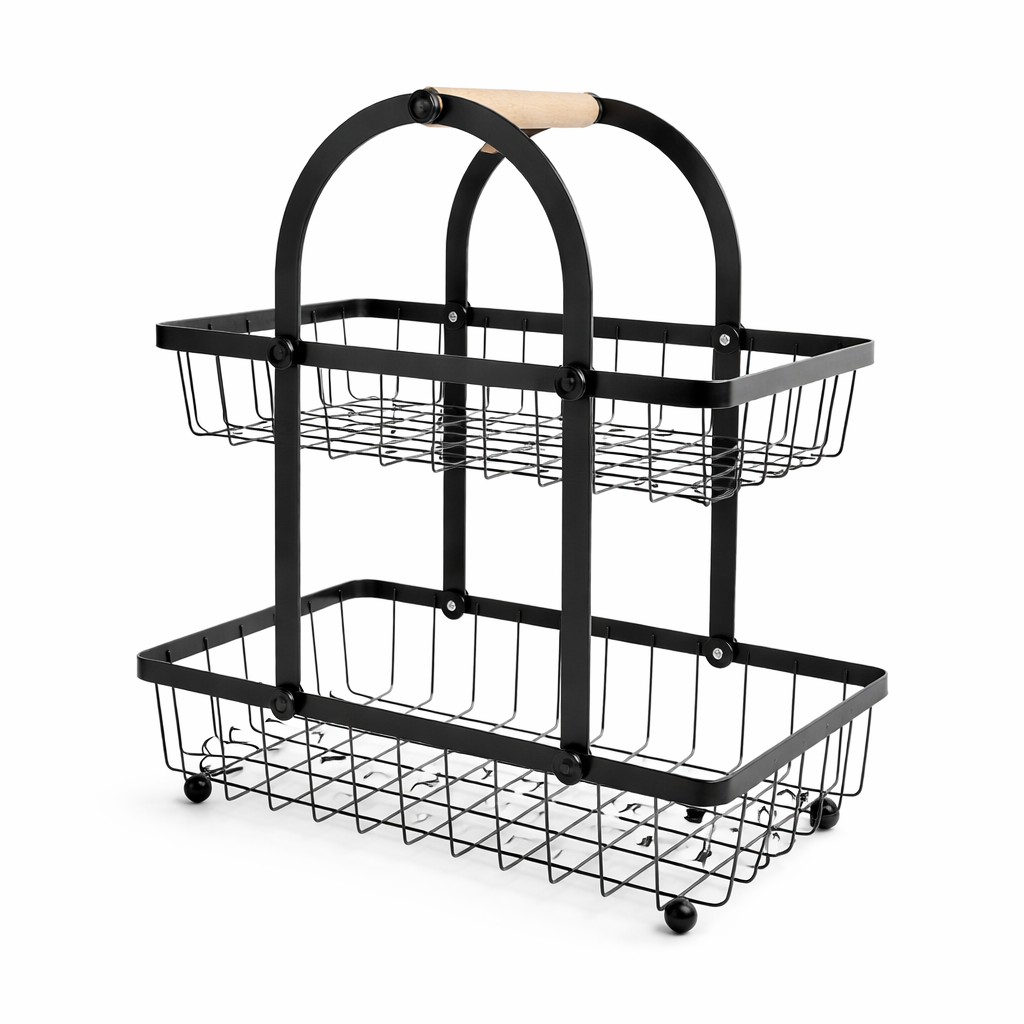 A Fruteira de Metal Dupla Preta é a solução ideal para quem busca organização, praticidade e um toque moderno na cozinha. Desenvolvida para armazenar frutas, legumes e até pães, ela possui dois andares bem distribuídos que facilitam a visualização dos alimentos e otimizam o espaço sobre bancadas, mesas ou ilhas. Fabricada em metal resistente com acabamento preto fosco, garante durabilidade, estabilidade e um visual elegante que combina com cozinhas modernas, industriais ou minimalistas. A estrutura vazada permite melhor circulação de ar, ajudando a conservar os alimentos por mais tempo. A alça superior em madeira natural facilita o transporte e acrescenta charme ao design, tornando a Fruteira um item funcional e decorativo para o dia a dia.