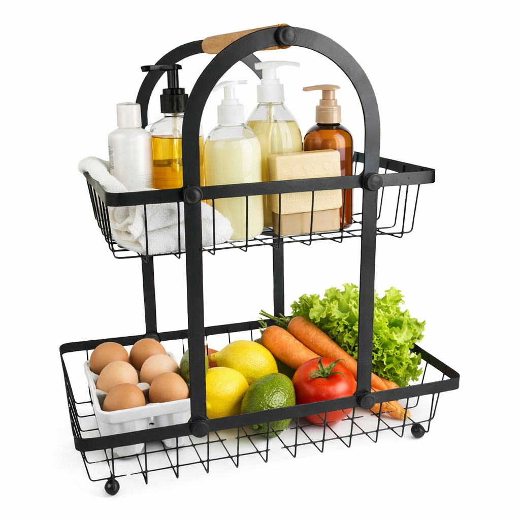 Design Duplo Funcional: A Fruteira de Metal Dupla Preta oferece dois níveis que ampliam a capacidade de armazenamento.