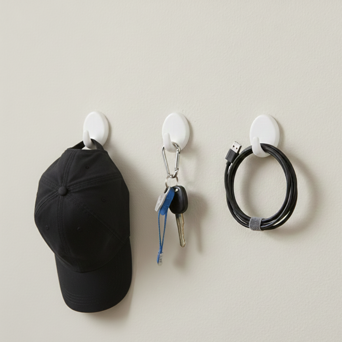 Fixação forte e segura: Gancho Adesivo de Plástico Multiuso suporta até 1,5 kg por unidade sem descolar.