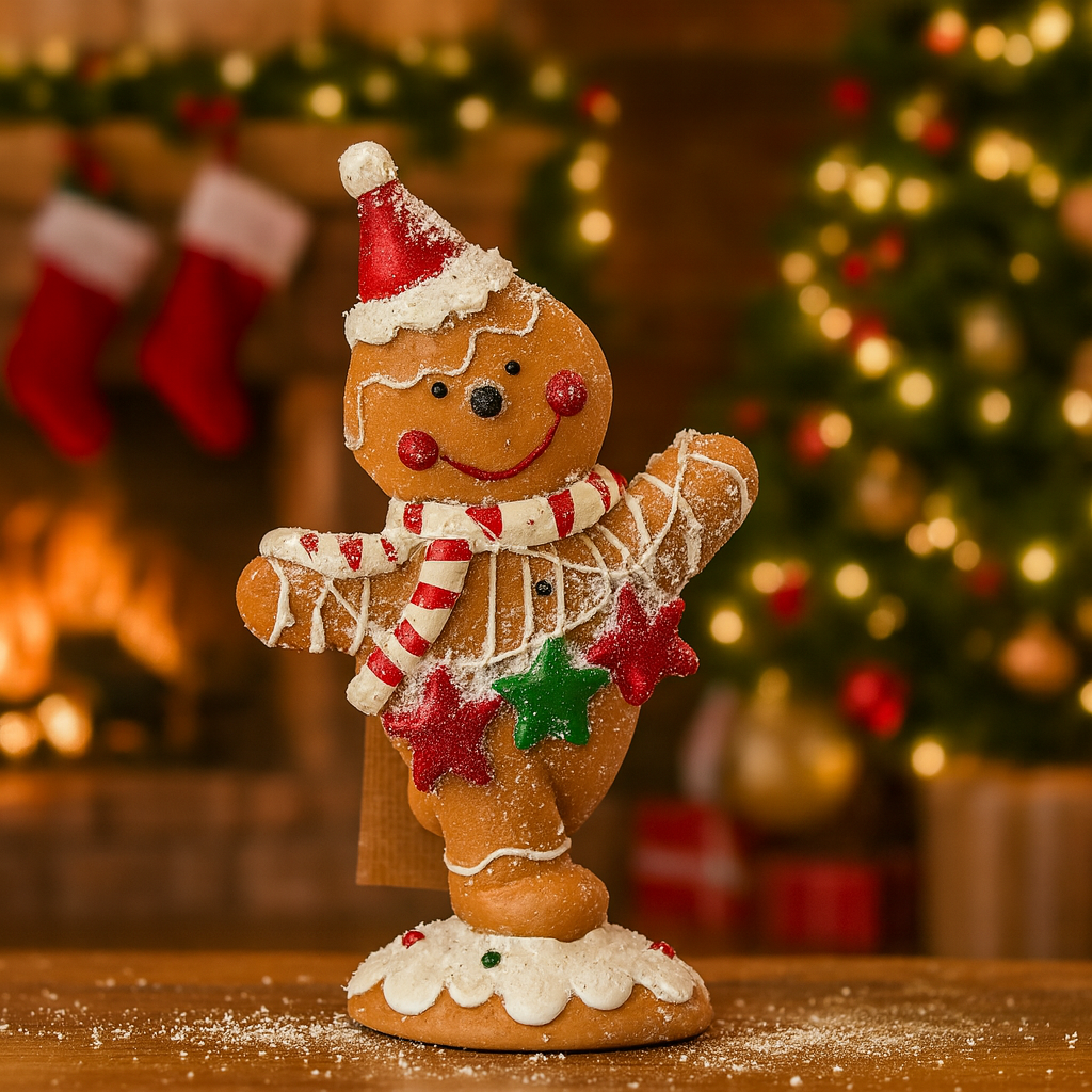 Com 14 cm de altura, o gingerbread exibe um design alegre e cheio de personalidade: usa um chapéu de Papai Noel, está decorado com doces listrados e estrelas coloridas nas cores vermelho e verde, e apresenta um delicado toque de brilho que remete ao açúcar dos biscoitos decorados. Seu acabamento minucioso traz um visual realista e festivo, ideal para deixar qualquer ambiente mais acolhedor.