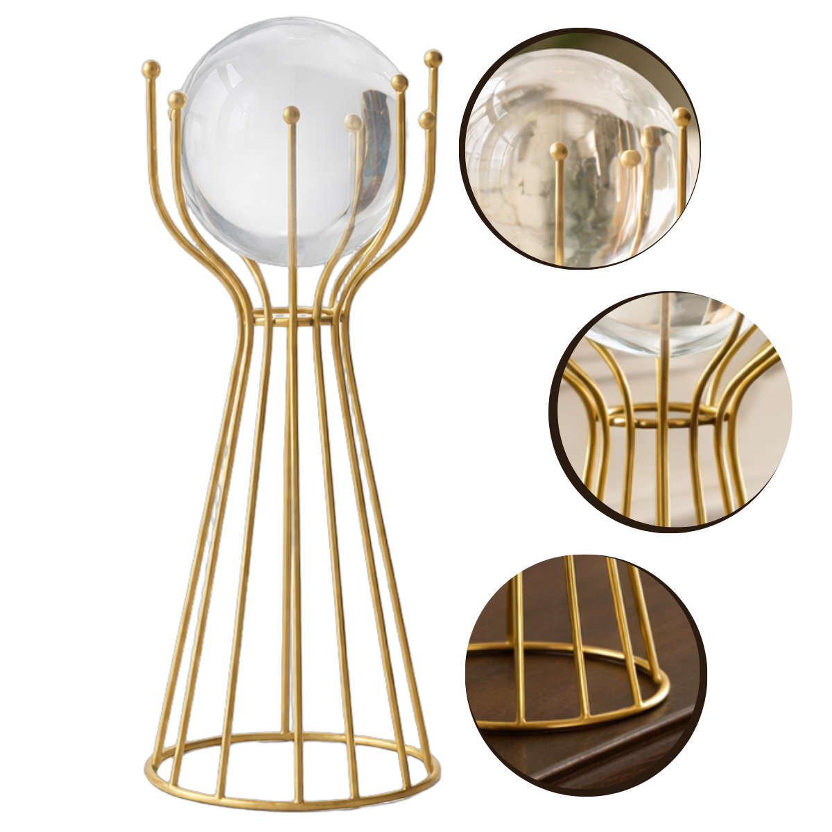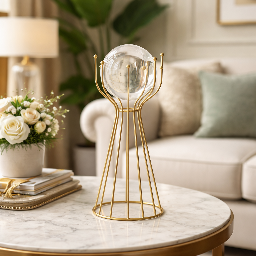 Globo de Vidro e Base de Ferro Decorativa Moderna é a escolha ideal para quem busca uma peça sofisticada, resistente e versátil para valorizar qualquer ambiente. Composto por um globo de vidro transparente apoiado em uma estrutura de decoração metálica dourada, o item combina elegância e durabilidade, tornando-se perfeito para salas, escritórios, hall de entrada ou espaços de destaque. Sua construção refinada proporciona equilíbrio visual, enquanto o design moderno adiciona personalidade e charme à composição, funcionando como ponto focal decorativo em mesas, aparadores ou prateleiras.