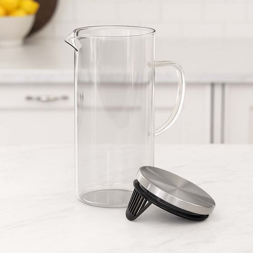 A tampa de aço inoxidável com filtro embutido oferece praticidade e higiene, evitando que frutas, folhas ou gelo saiam ao servir. Seu bico dosador proporciona um fluxo suave e preciso, sem respingos, garantindo uma experiência agradável e sem desperdícios.