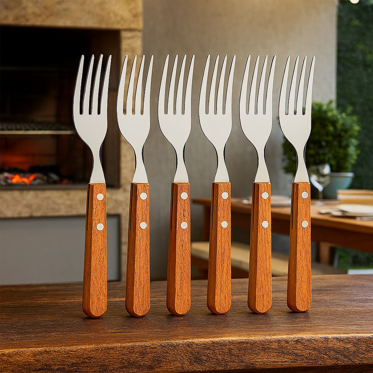 O garfo, com seus dentes firmes e resistentes, auxilia no corte e manuseio das carnes, complementando a funcionalidade do conjunto. A combinação de aço inox e madeira natural Ipê resulta em um conjunto de beleza e requinte, perfeito para impressionar seus convidados.