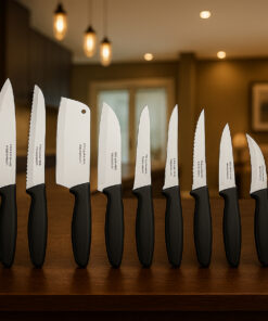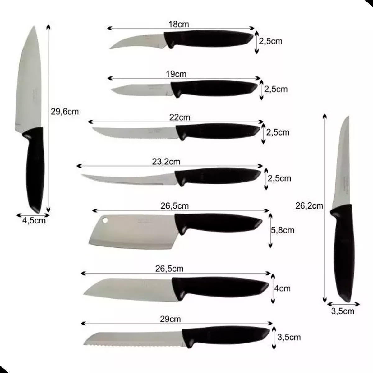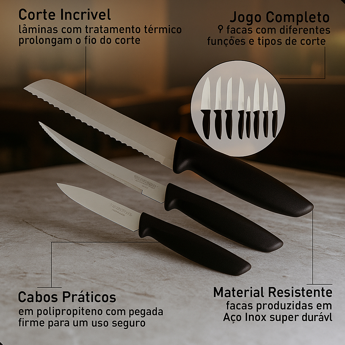 Jogo de Facas Tramontina Plenus 9 Peças – Conjunto completo com 9 facas resistentes em inox, ideal para cortes precisos no preparo de carnes, legumes, pães e muito mais.
