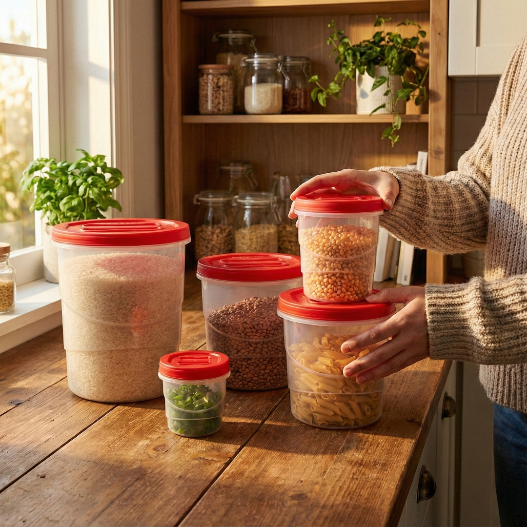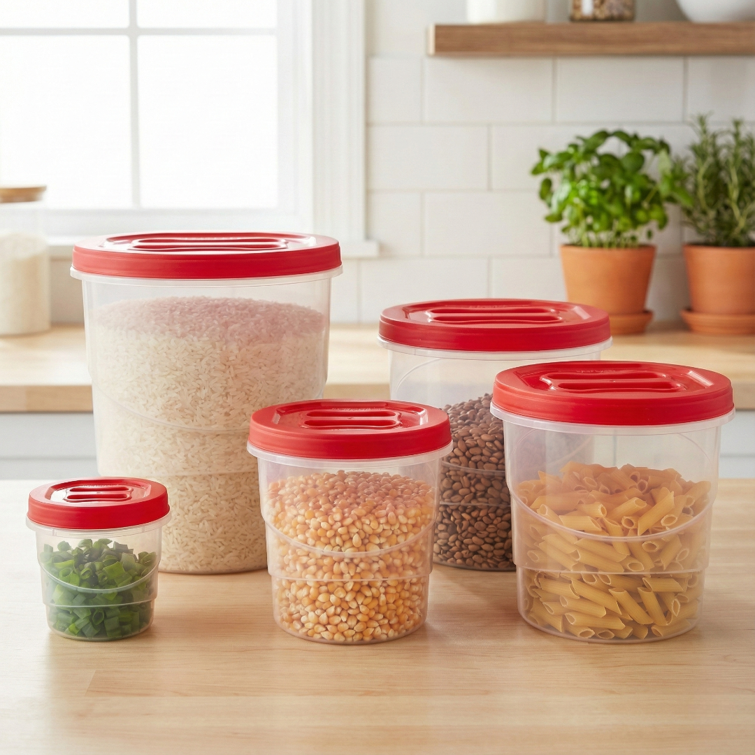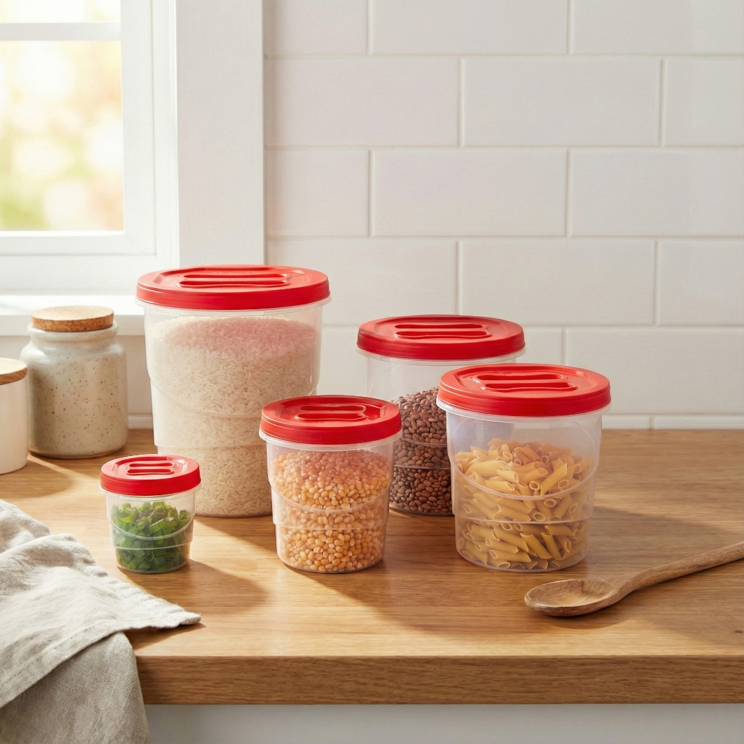 Este jogo de potes mantimento facilita o aproveitamento de espaço interno em armários ou prateleiras de forma inteligente.