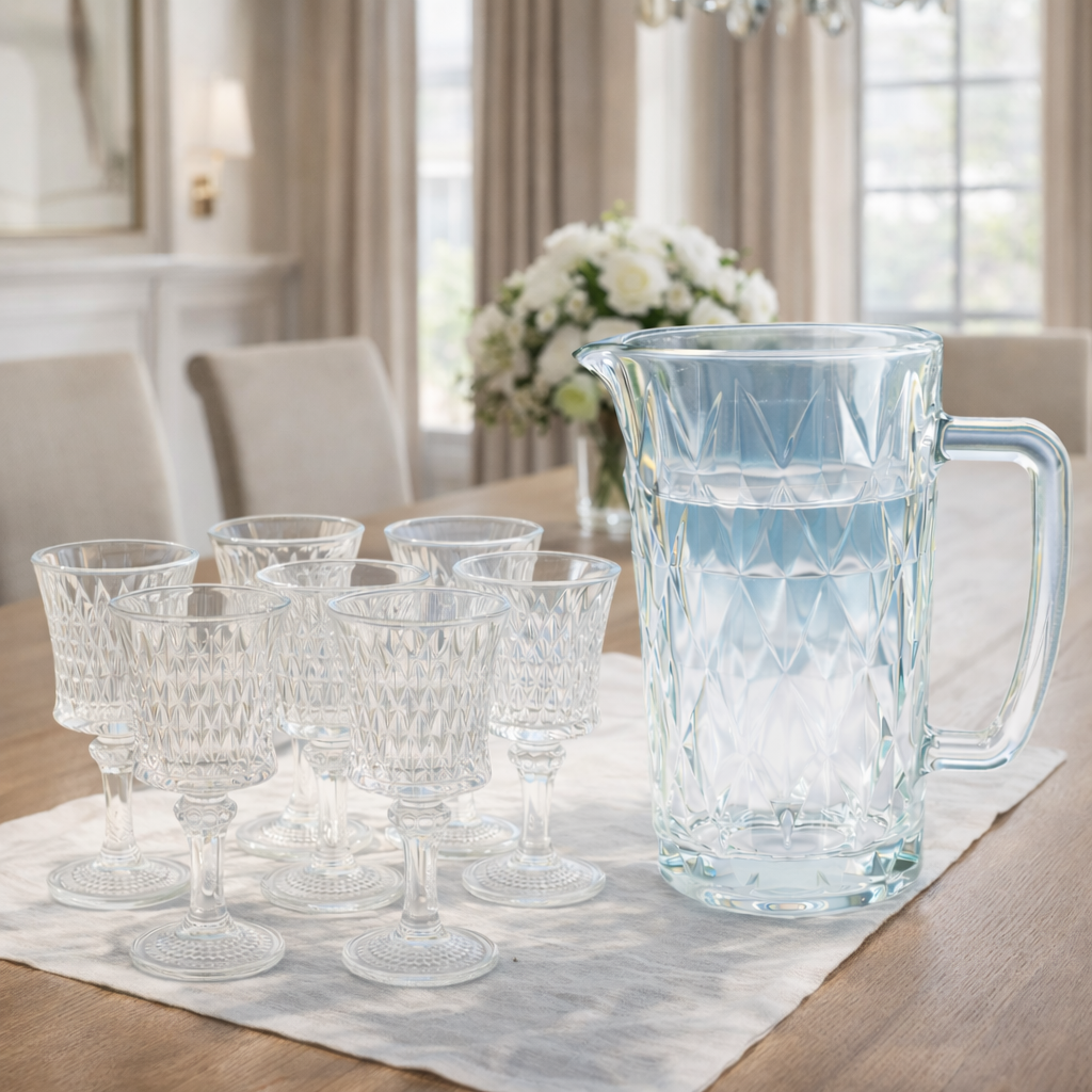 O Kit 12 Taças de Vidro com Jarra é a escolha ideal para quem busca sofisticação e praticidade ao servir água, suco e diversas bebidas. Produzido em vidro transparente de alta qualidade, o conjunto possui acabamento lapidado que valoriza a mesa posta e proporciona um toque refinado em qualquer ocasião. Perfeito para uso diário ou eventos especiais, o kit une resistência, beleza e funcionalidade. Seu design clássico combina com diferentes estilos de decoração, tornando cada momento ainda mais especial com o Kit 12 Taças de Vidro com Jarra.