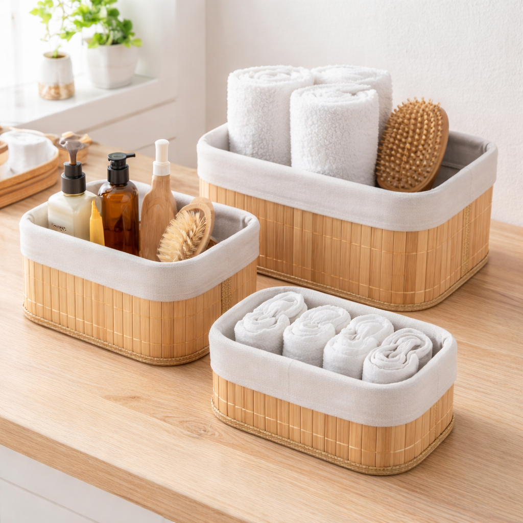 Kit 3 Cestos de Bambu é a solução ideal para quem busca organização prática aliada a um visual natural e sofisticado. Produzidos em bambu resistente e sustentável, esses cestos organizadores são perfeitos para otimizar espaços em diversos ambientes da casa, como cozinha, banheiro, quarto, escritório ou lavanderia. Com três tamanhos diferentes, permitem armazenar alimentos, utensílios, cosméticos, acessórios, toalhas, papéis ou objetos do dia a dia de forma funcional e elegante.