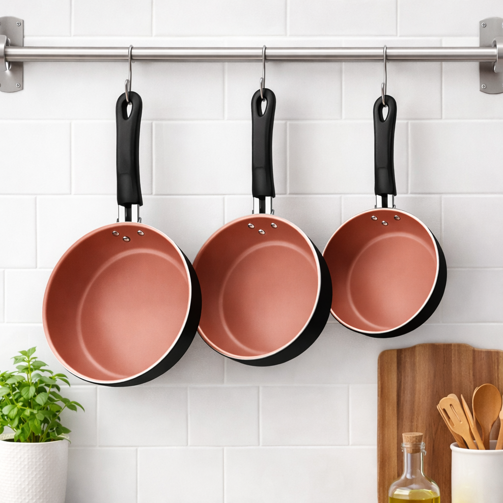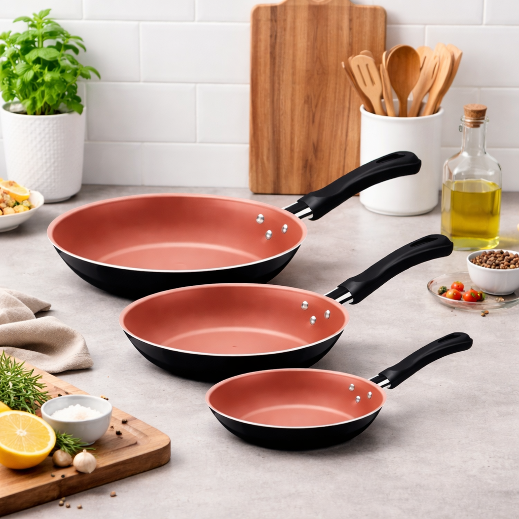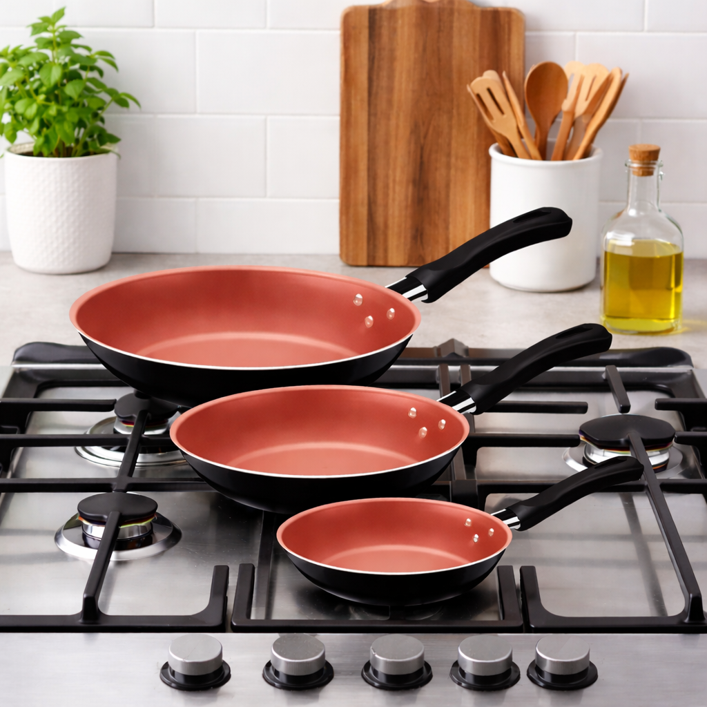 Três Tamanhos Funcionais: Inclui frigideiras de 16 cm, 20 cm e 24 cm, ideais para diferentes tipos de preparo.