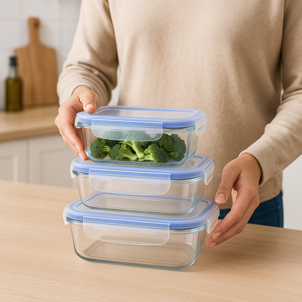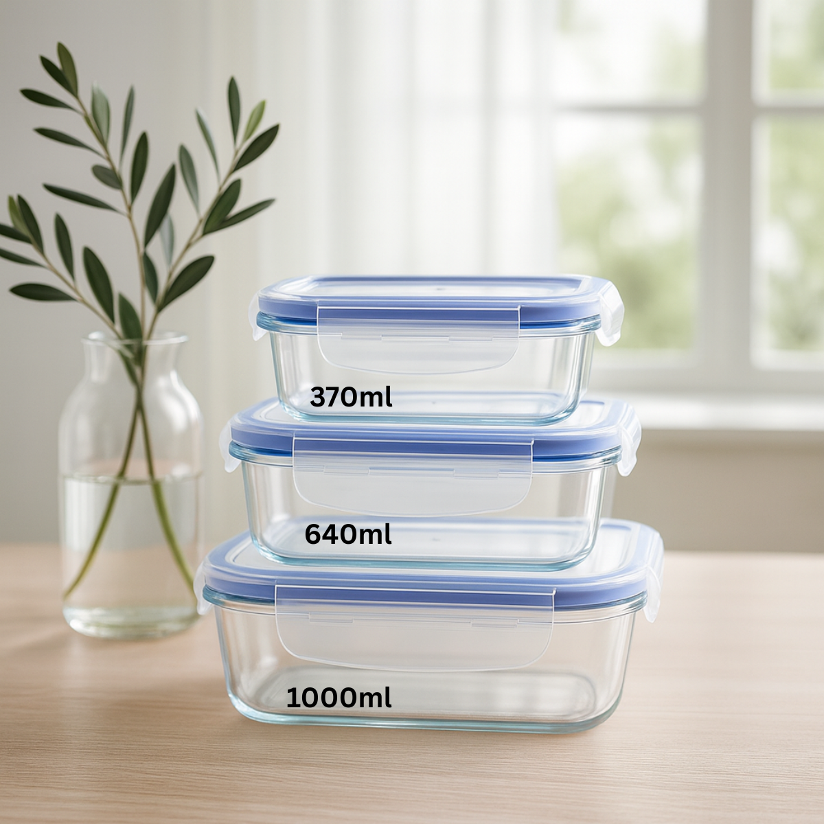 Tamanhos variados: Conjunto com capacidades de 370ml, 640ml e 1000ml, ideal para diferentes porções e tipos de alimentos.