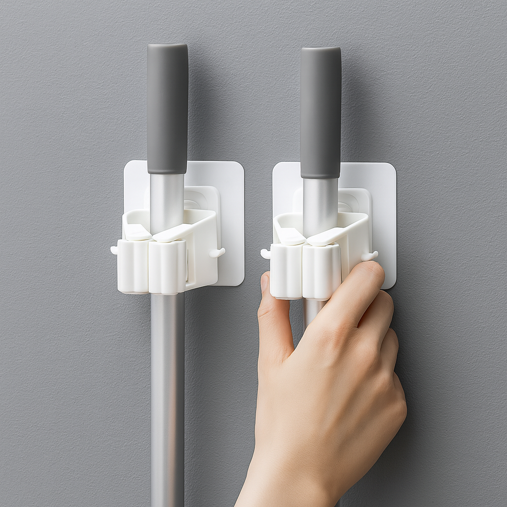 Sistema de pressão firme que segura utensílios com estabilidade, funcionando como gancho eficiente.