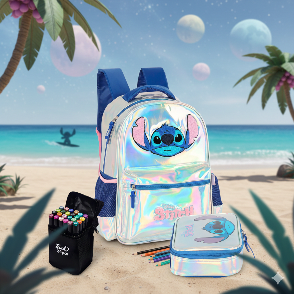Kit mochila Estojo e canetinha Estitch Prata + 24 canetinhas de brinde
