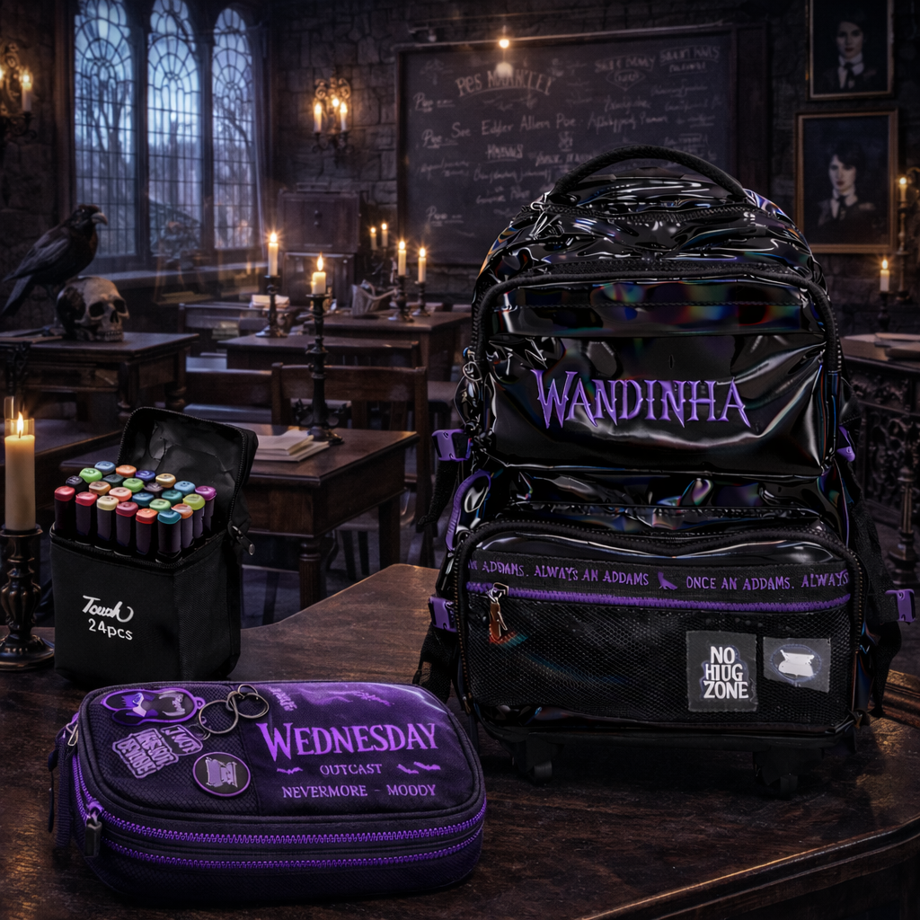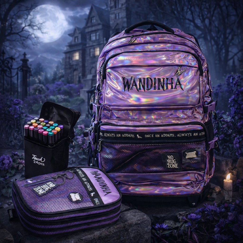 Kit Mochila Wandinha com Rodinhas Estojo e Canetinhas PK STORE é a escolha perfeita para estudantes que buscam praticidade, conforto e um visual marcante inspirado na personagem Wandinha. Desenvolvida para a rotina escolar, esta mochila une funcionalidade e estilo em um acabamento holográfico moderno que se destaca em qualquer ambiente. Possui amplo espaço interno para livros, cadernos e materiais escolares, além de bolsos organizadores que facilitam o dia a dia. Produzida em material resistente, garante maior durabilidade mesmo com uso frequente. As rodinhas reforçadas e a alça retrátil proporcionam transporte confortável, reduzindo o peso nas costas e tornando o deslocamento mais leve e seguro. Ideal para escola, cursos e atividades diárias, é uma mochila versátil que atende crianças e adolescentes com eficiência e personalidade.