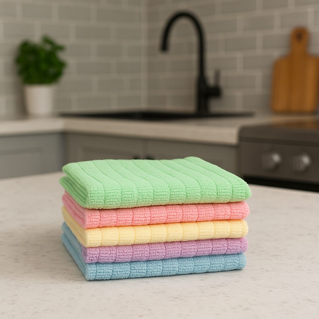 O conjunto contém cinco panos em cores suaves e alegres — azul claro, amarelo, lilás, verde e rosa — permitindo organizar o uso de cada um por ambiente ou função: um para a cozinha, outro para o banheiro, um para vidros, outro para móveis e mais um para uso geral. O tamanho de 30x30cm é ideal para manuseio fácil e eficiente, além de ser compacto para guardar e lavar.