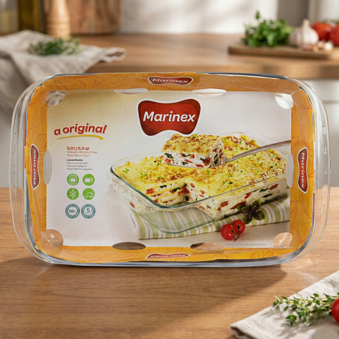 Fabricada em vidro temperado de alta qualidade pela Nadir Figueiredo, esta assadeira é extremamente versátil. A lasanheira 5 litros retangular suporta choques térmicos, podendo ir do forno diretamente para a mesa e depois para a geladeira ou freezer. Seu formato retangular e fundo é ideal para montar camadas generosas de lasanha, assados grandes e sobremesas para muitas pessoas, garantindo um cozimento uniforme e uma apresentação impecável.