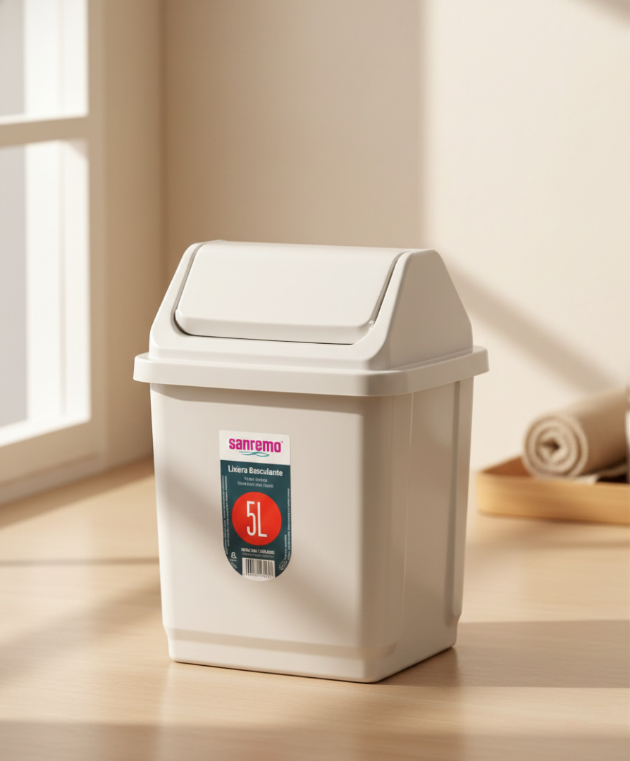 A versatilidade desta lixeira basculante 5 litros Sanremo permite seu uso em diversos cômodos, combinando funcionalidade com uma estética clean. O acabamento em polipropileno de alta qualidade garante resistência contra impactos e umidade constante, sendo a escolha inteligente para quem busca praticidade na rotina doméstica.