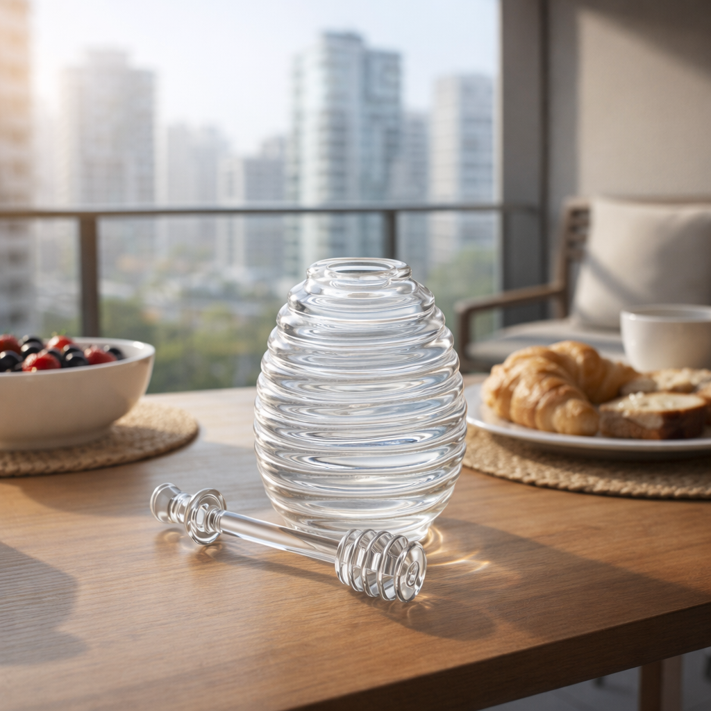 A Meleira Colmeia Transparente em Acrílico é a escolha perfeita para quem busca funcionalidade, organização e um toque decorativo ao servir mel.