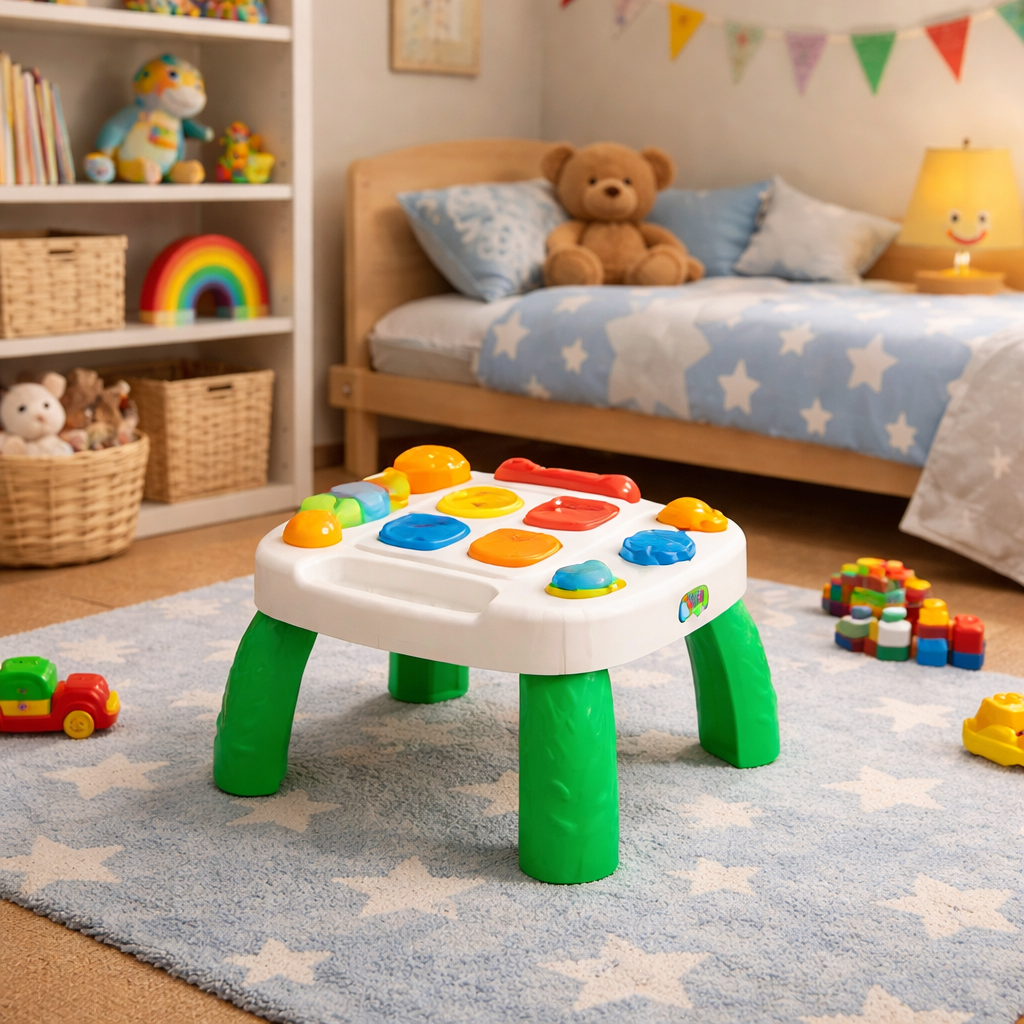 Design pensado para crianças pequenas, facilitando o manuseio e incentivando descobertas da mesinha.